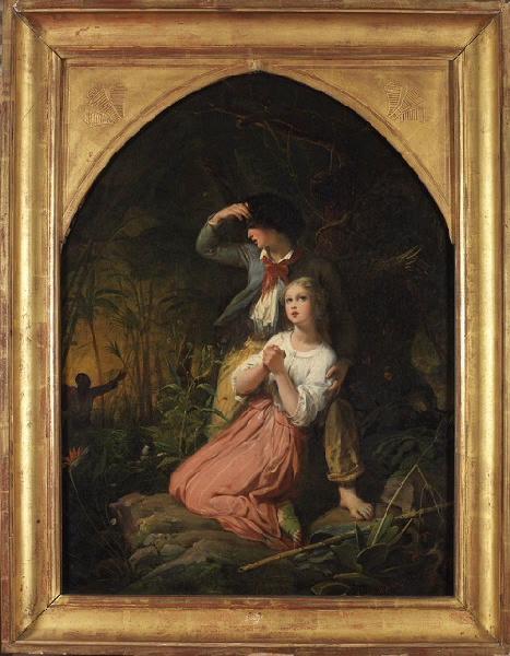 Au centre du tableau, dans un schéma classique, le peintre inscrit les corps de Paul et Virginie dans une composition triangulaire : au premier plan, la jeune fille agenouillée, mains jointes exprimant le remerciement ou la prière; au second plan, Paul debout jambes écartées, la tête tournée en direction de Domingue dont la silhouette apparaît dans la partie gauche du tableau. Le coude du bras droit replié du jeune homme pointe en direction de l'esclave qui vient porter secours aux enfants perdus dans la forêt. Le peintre s'est attaché particulièrement au traitement du beau visage angélique de Virginie dont la pâleur et la pureté des traits contrastent avec l'obscurité environnante. La nuance des couleurs choisies pour les vêtements - rose pour la jupe, blanc pour le corsage et la chemise, jaune pour le pantalon, bleu pour la veste et rouge pour la cravate - et le rendu des étoffes, donnent à l'oeuvre un style maniériste emprunt également d'une touche de baroque.