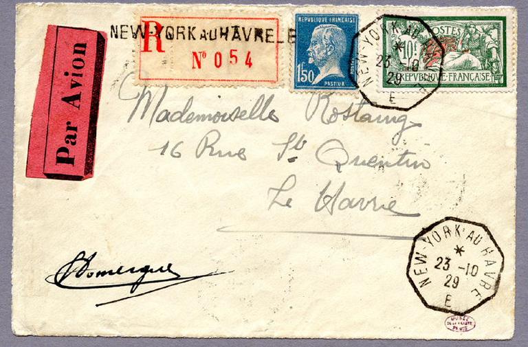 Lettre acheminée par hydravion, Lioré-Olivier, 420 CV, catapulté du paquebot 'Ile de France', au cours du voyage retour New York - Le Havre, le 23 octobre 1929. Le pilote était le lieutenant de vaisseau Domergue. Le but était de permettre un gain de 24 heures sur le trajet maritime restant à parcourir, afin que la lettre puisse profiter de la première distribution du matin, aussi bien à New York qu'à Paris. Ainsi quatre liaisons postales aériennes dans chaque sens furent effectuées en 1929 par le pilote Domergue. Celui-ci a apposé sa signature sur le pli ; voir aussi : Paquebot Ile de France (1990.24.1)