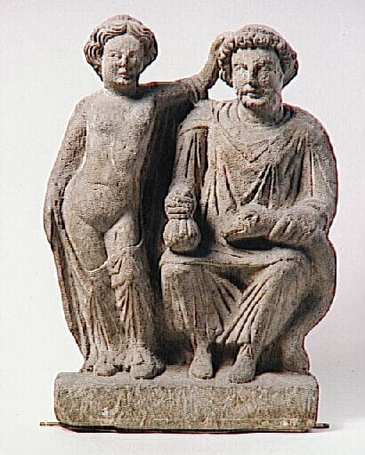 scène mythologique (couple : divinité, tunique, manteau, barbe, bourse, déesse, draperie)
