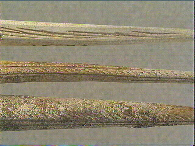 Sur la face supérieure, une nervure médiane porte des stries obliques. Elle est cantonnée de lignes longitudinales. Faible rainure longitudinale sur la face inférieure.