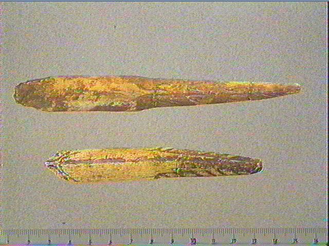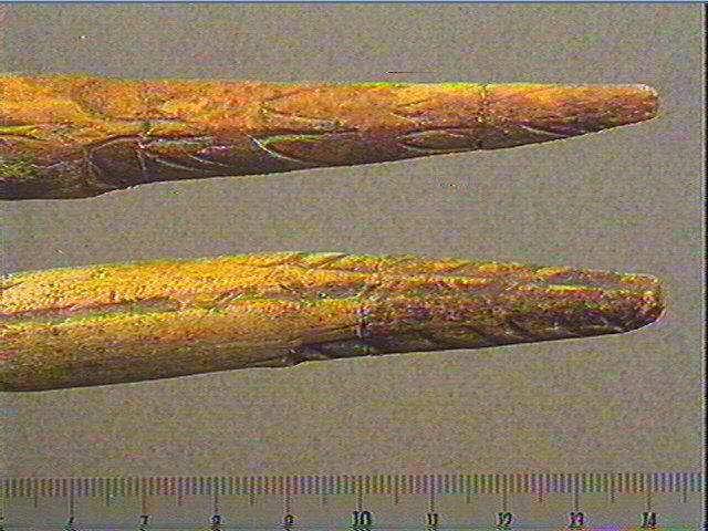Face supérieure : ramure de cervidé à la base et une rainure longitudinale, bordée, de chaque côté, de stries obliques et parallèles, près de la pointe.