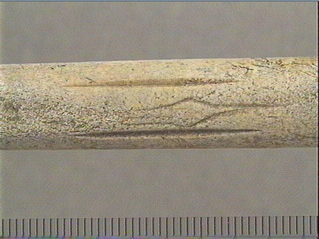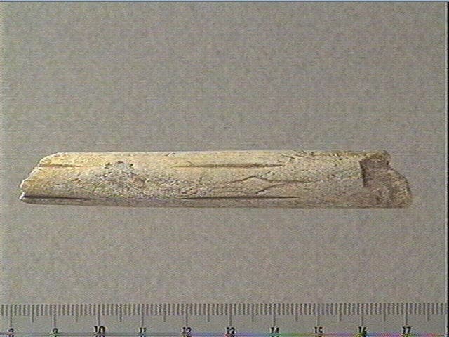 Incision en v. Sur la face supérieure : motif fusiforme, se terminant en pointe à une extrémité, et non fermé à l'autre extrémité. Ce motif est encadré d'une rainure longitudinale de chaque côté. Après une interruption, les rainures reprennent jusqu'à la fracture. Sur la face inférieure : stries obliques.