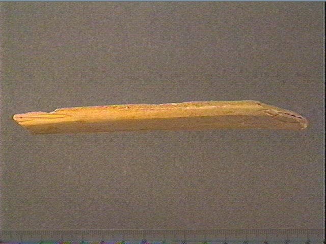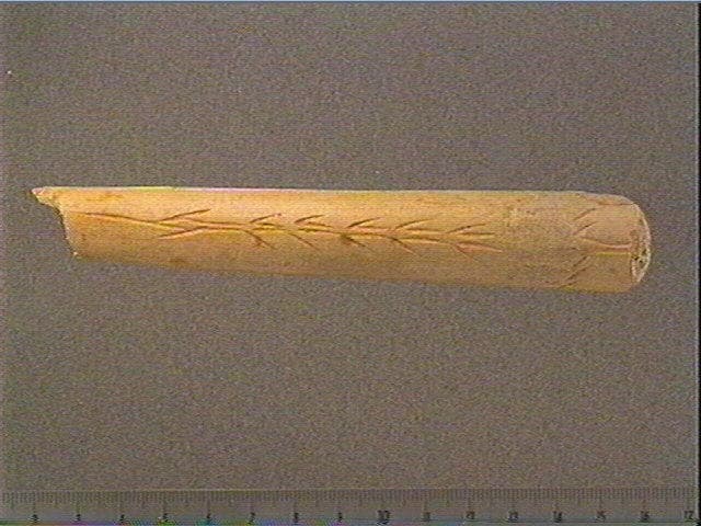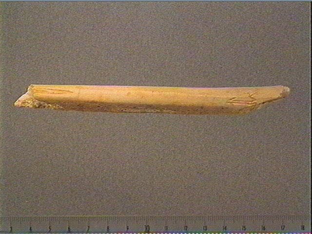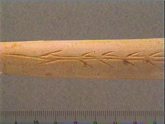 Face supérieure: rangée longitudinale de motifs angulaires accolés, stries obliques et longitudinales, motif complexe. Côté gauche: motif angulaire (flèche). Côté droit: motif angulaire.