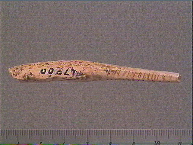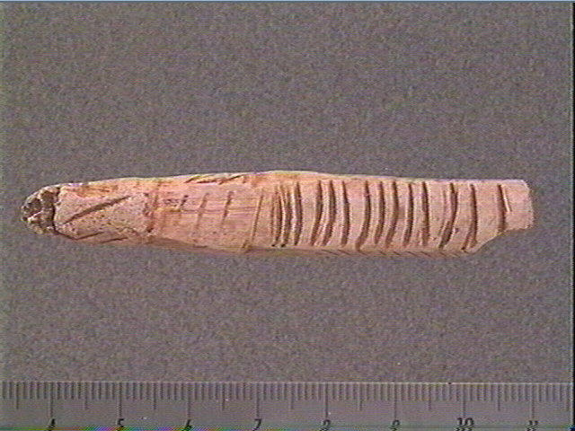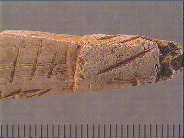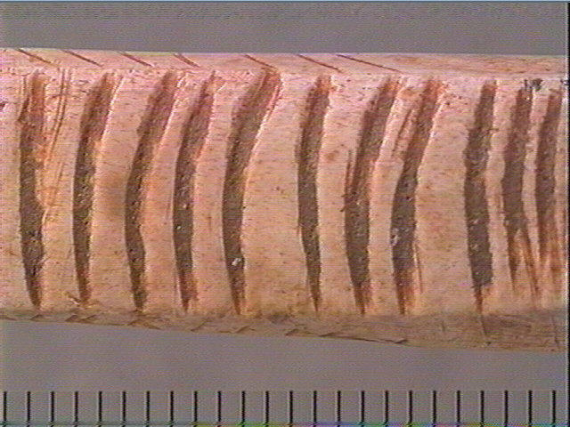 Sur la face supérieure : stries transversales et parallèles. A la base : stries obliques. Sur les côtés de la partie mésiale : stries obliques alignées. Sur la face inférieure de la base : stries obliques alignées.