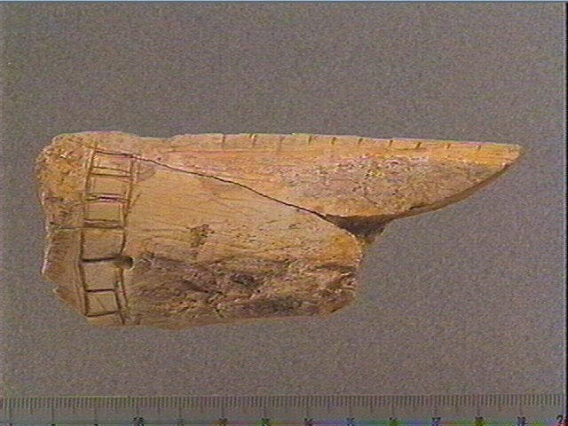 Face supérieure : Anneau partiel formé de deux cercles à l'intérieur desquels sont alignées des stries régulières, transversales par rapport aux cercles. Côté droit : rainure longitudinale bordée de stries alignées.