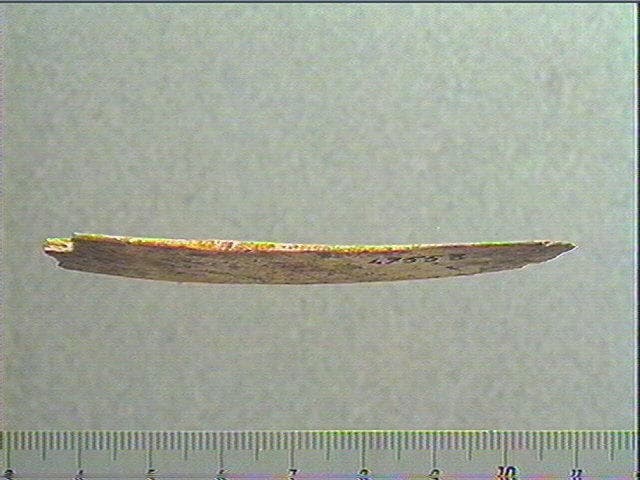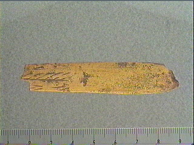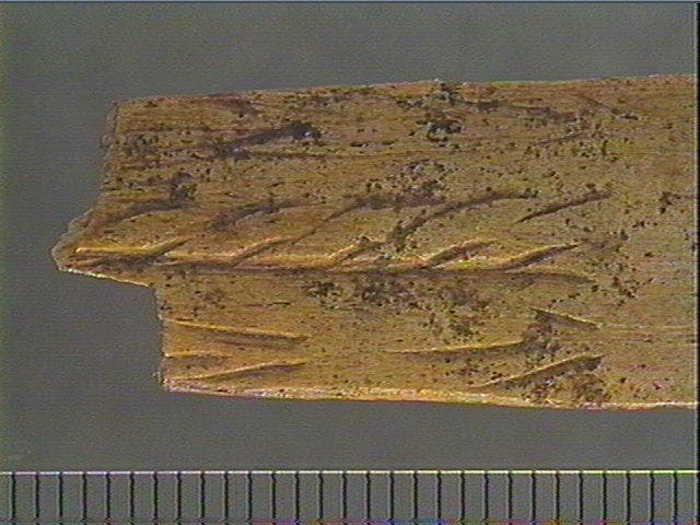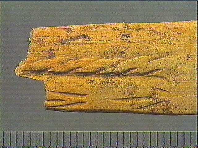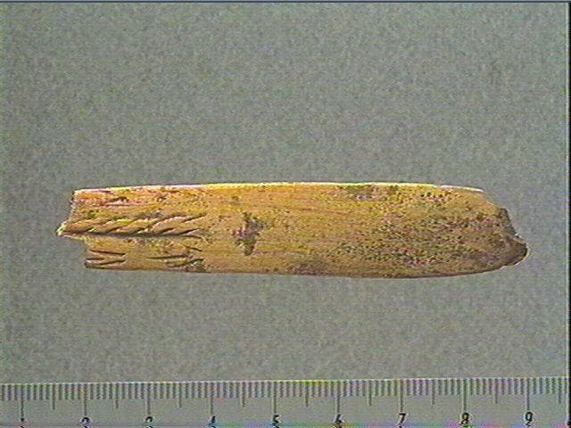 Incision dissymétrique. Face supérieure : rainure longitudinale accompagnée de stries obliques alignées. A côté : 2 motifs angulaires en flèches.