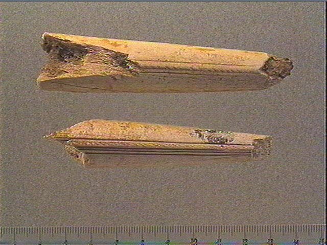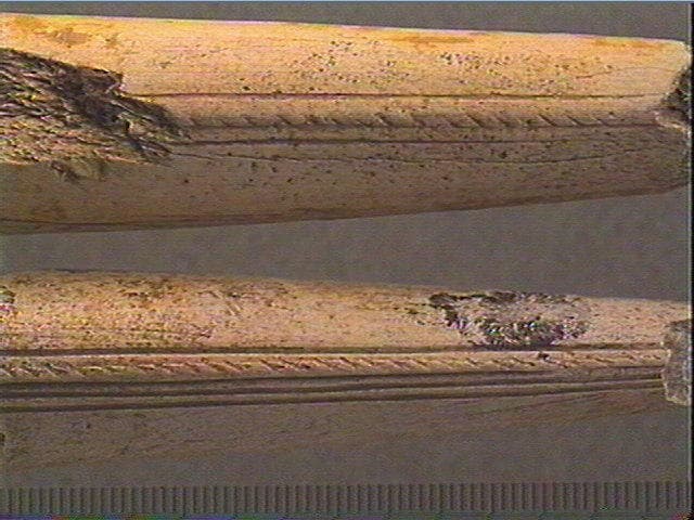 Sur une face, fine rainure longitudinale portant des stries obliques en léger relief. Cette rainure est bordée d'une part, d'une fine rainure longitudinale et d'autre part, de 3 rainures longitudinales.