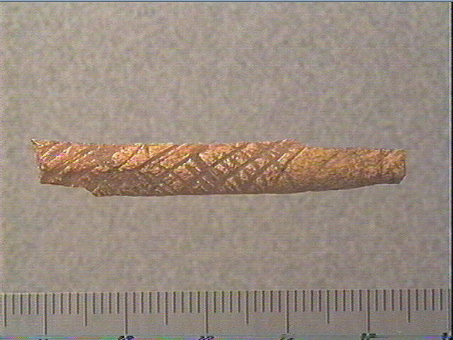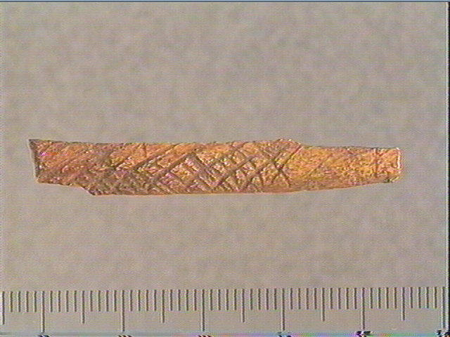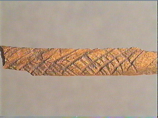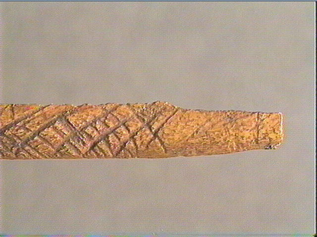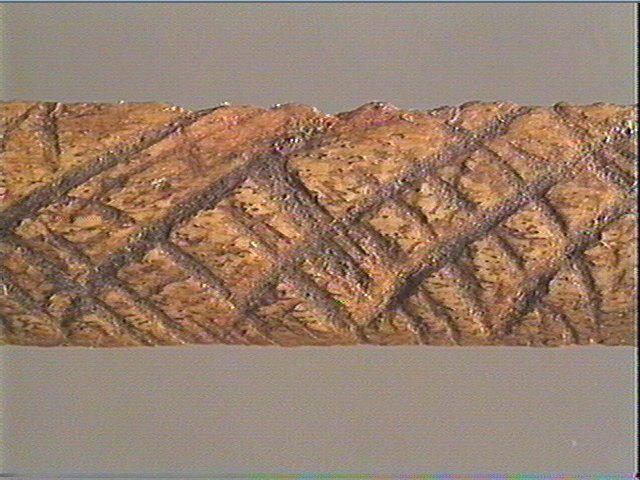 Incision en v profonde. La face supérieure est décorée de quadrillages obliques irréguliers et de stries obliques.
