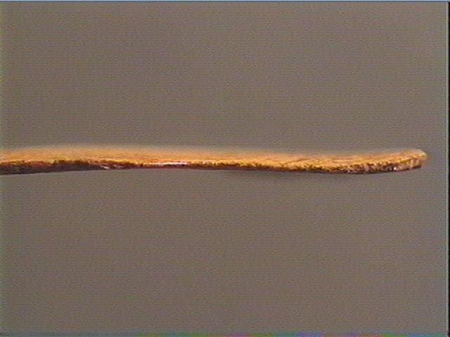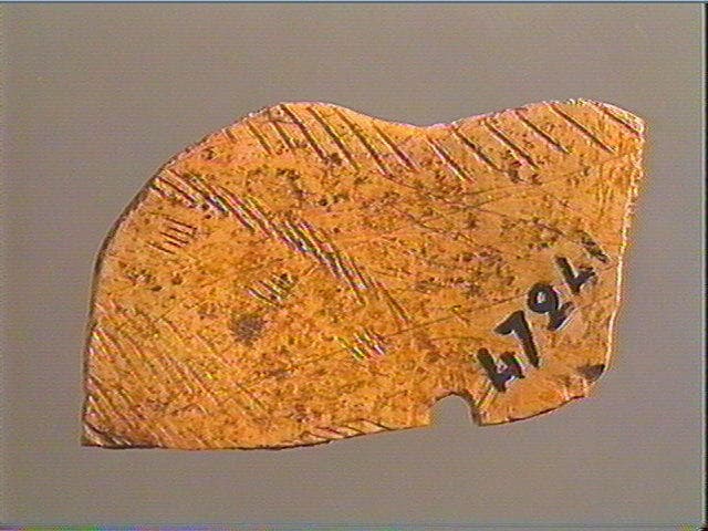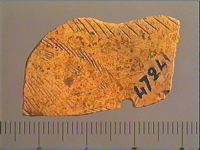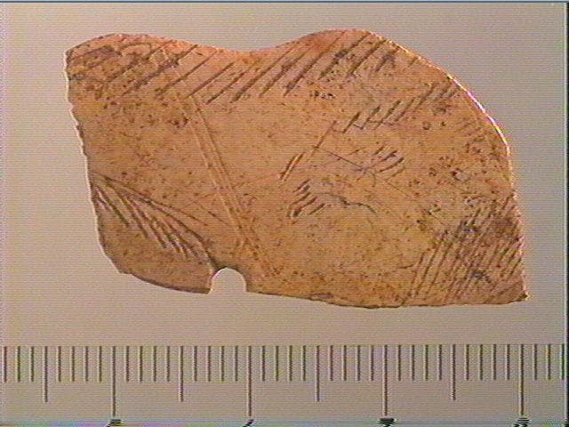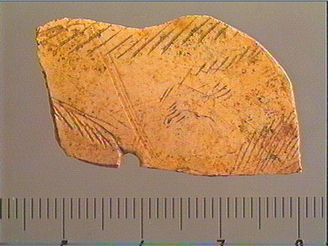 Le contour découpé pourrait être celui d'un animal. Un groupe de lignes obliques et parallèles souligne le bord. D'autres groupes semblables pourrait figurer le pelage. Il ne reste qu'une partie de ce contour découpé, d'où la difficulté d'interpréter le décor de cet objet.