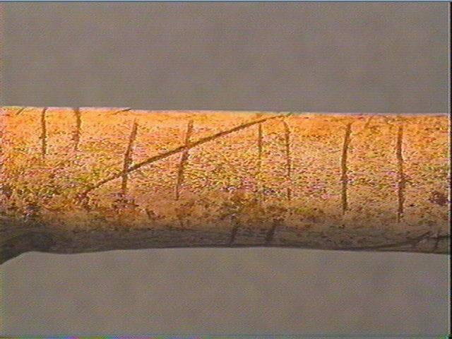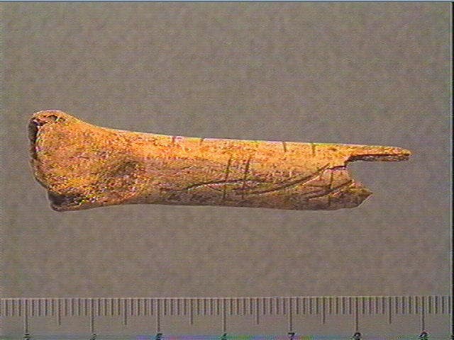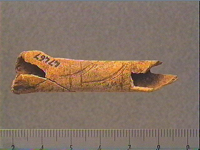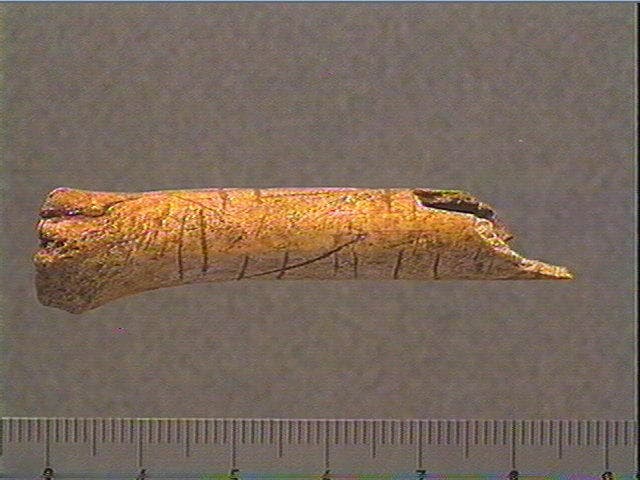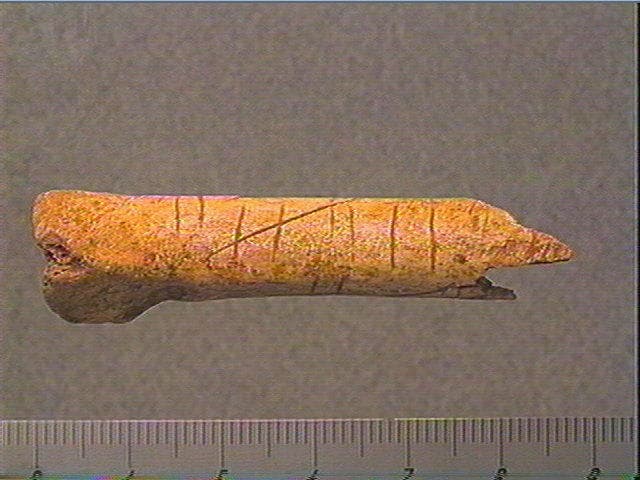 Incision large. Sur une face, plus de neuf traits transversaux, traits alignés dont certains sont barrés par la même incision oblique. Sur l'autre face, 2 doubles traits transversaux et parallèles, recoupés par 2 groupes de lignes courbes.