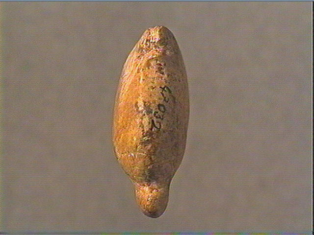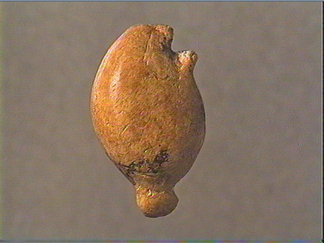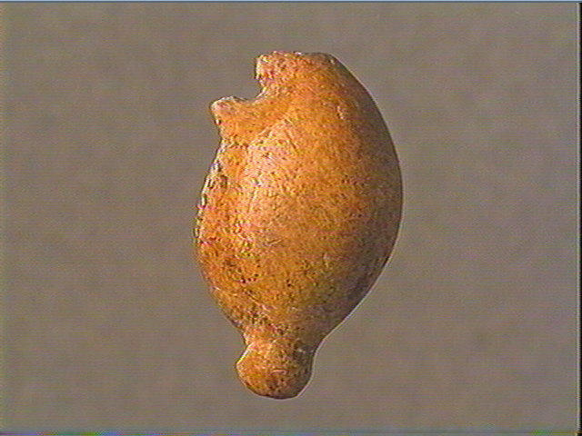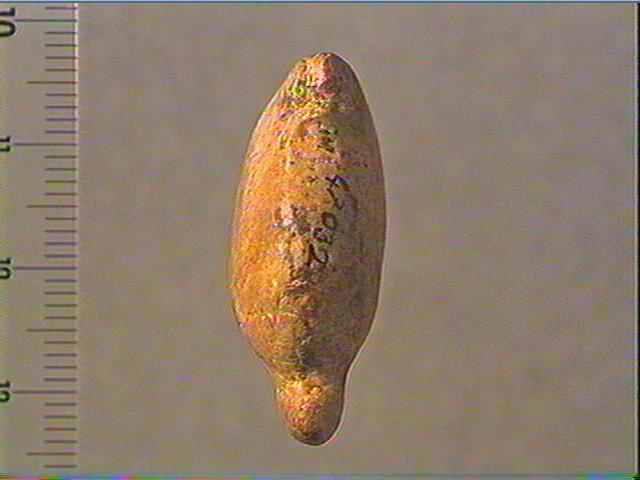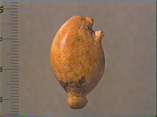 Renflement à une extrémité. A l'autre, une perforation fracturée. Forme ovoïde