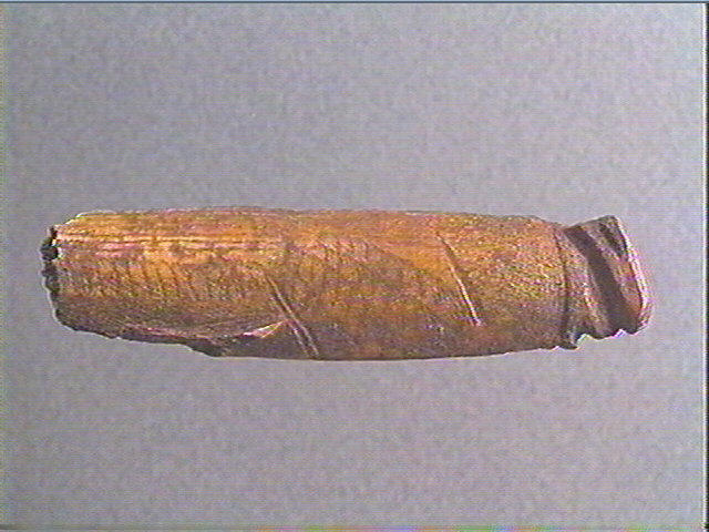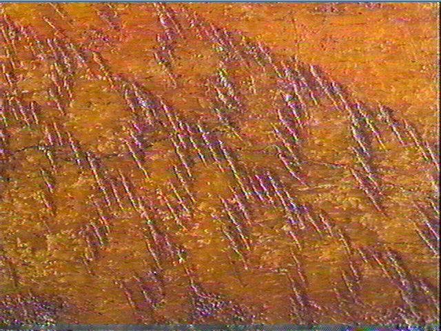 Sur une face : décor géométrique exceptionnel fait de fines stries transversales et parallèles sur une partie de la pièce, ou obliques bordées des petites stries transversales sur une autre partie, ou encore longitudinales et parallèles. A l'extrémité, se trouve une protubérance dont le départ est souligné par une strie transversale courbe et près de laquelle on note une perforation fracturée. Sur une autre face : fines incisions parallèles, longitudinales Sur chaque face : une arête brisée.