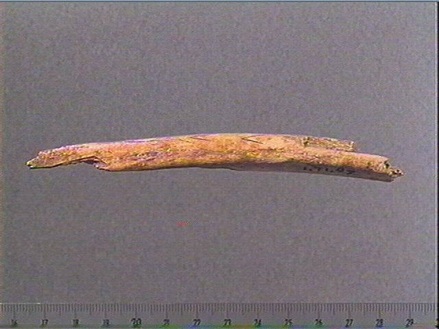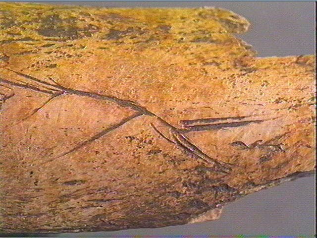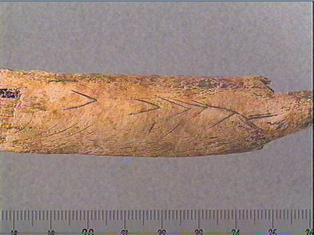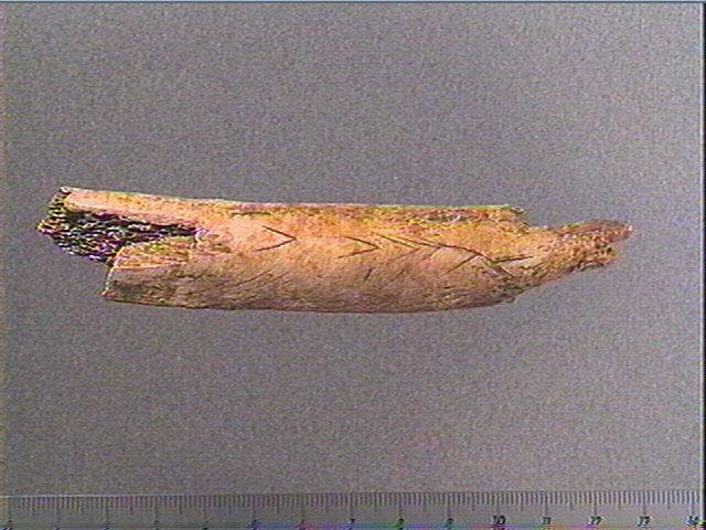 Incision en v. Sur une face, plusieurs chevrons emboîtés irréguliers s'achevant par un double chevron en sens inverse. Plusieurs stries courbes et obliques alignées.