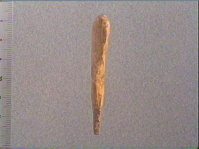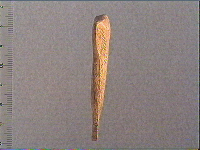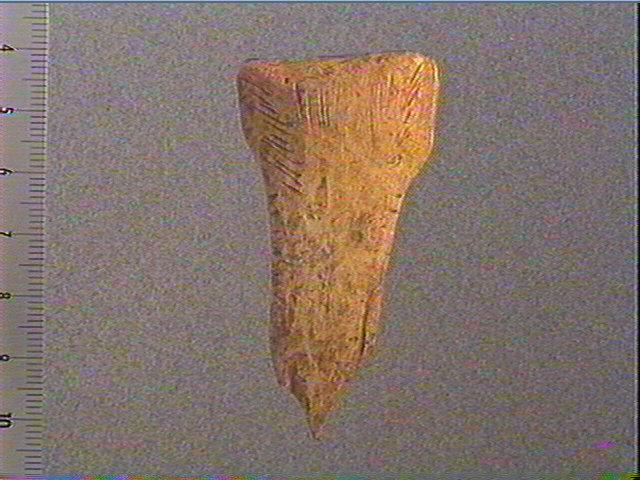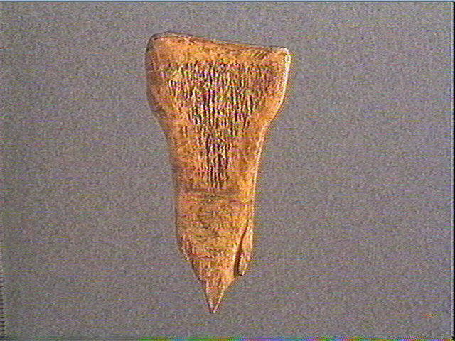 Stries longitudinales, obliques et transversales alignées. La forme de l'objet rappelle l 'extremité d'une queue de poisson.