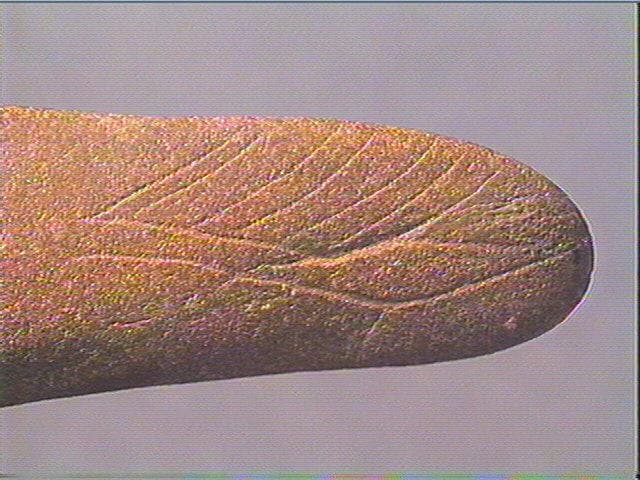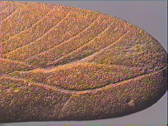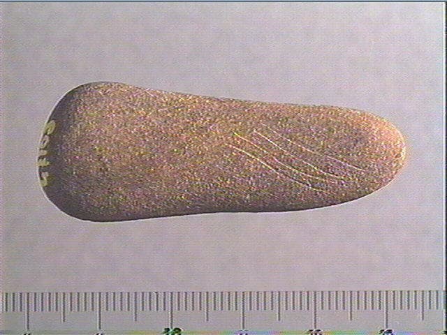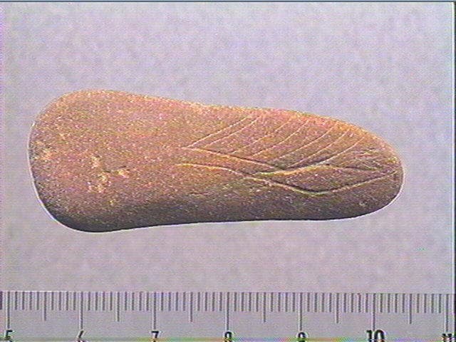 Sur une face : motif losangique accompagné d'une ligne double striée. La seconde ligne est bordée une série d' incisions courbes et parrallèles. Sur l'autre face : quatre incisions courbes, obliques et parallèles
