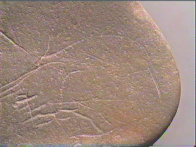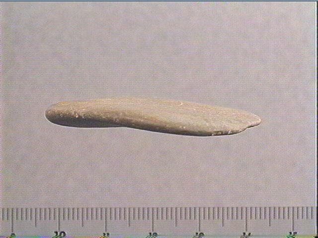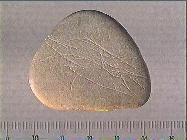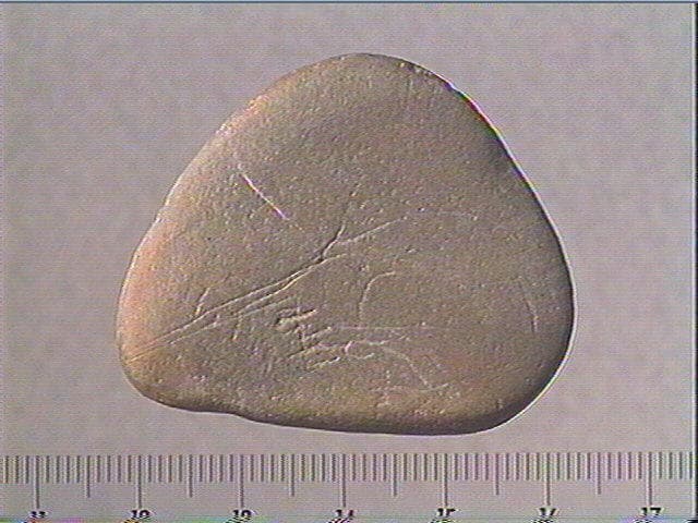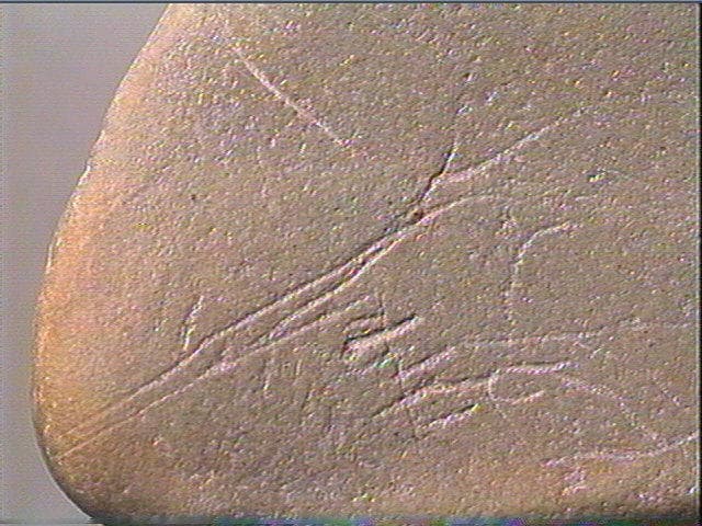 Enchevêtrement de traits obliques et courbes sur les deux faces. Chollot pensait à un oiseau et à une tête de félin.