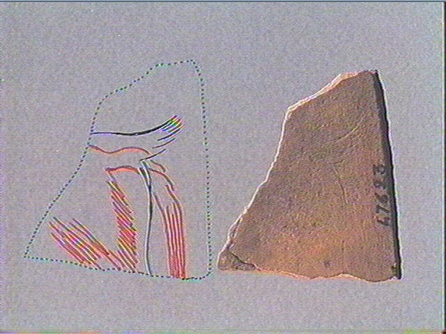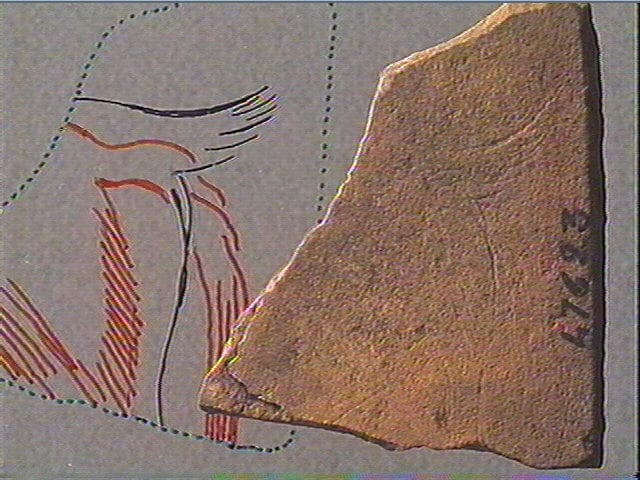 Sur une face, deux arrière- trains d'animaux de profil : gauche. L'un présente (en noir sur le relevé) une ligne dorsale fracturée, une queue levée, une patte postérieure. L'autre présente(en rouge sur le relevé) une longue queue, des hachures pour le pelage et une patte postérieure. Sur l'autre face, traits indéterminables.