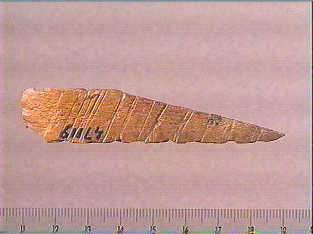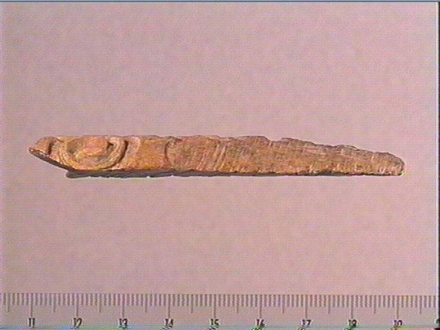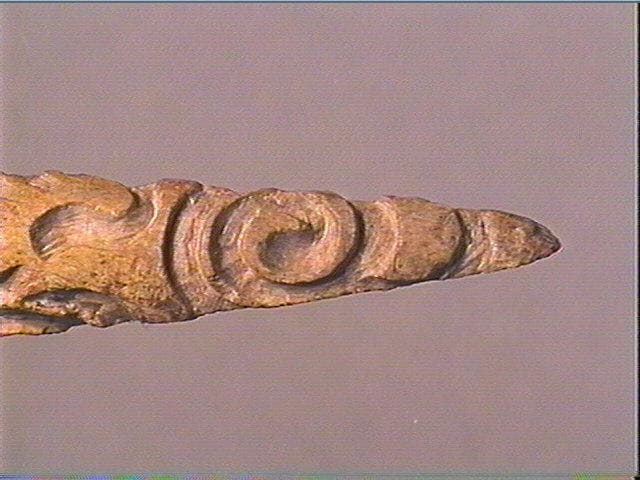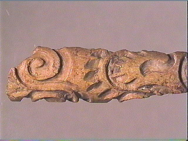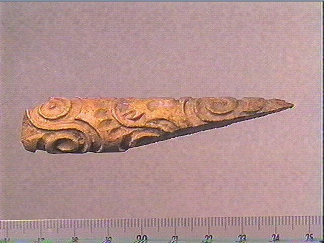Face supérieure : décor en spirales, certaines doubles et un motif fait d'une double rangée 'd'encoches', chacune séparée par une ligne étroite en relief et par une ligne sinueuse en relief. Ce décor rappelle celui d'une feuille. Noter un biseau, sur un bord, strié (stries obliques parallèles). Face inférieure : stries obliques parallèles.