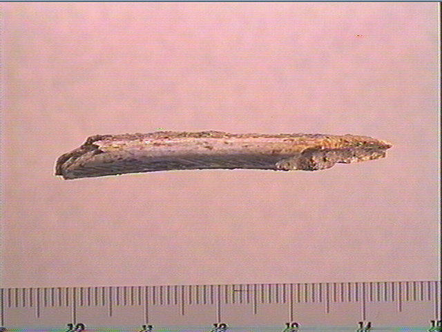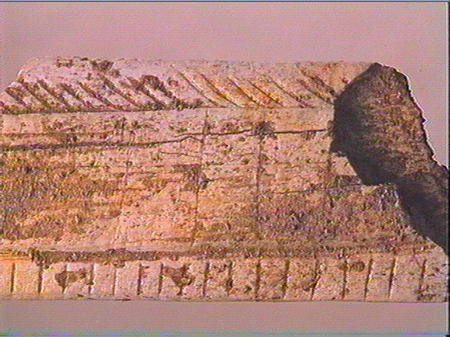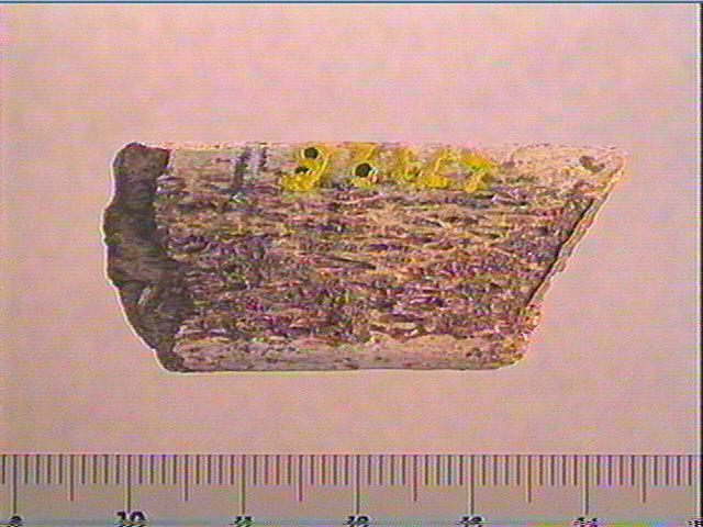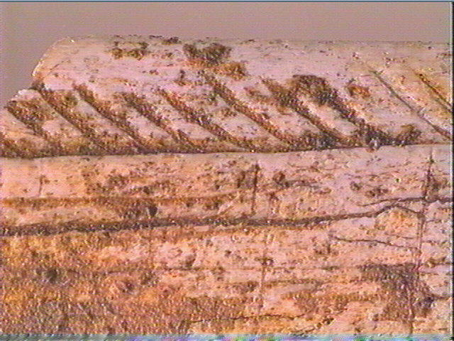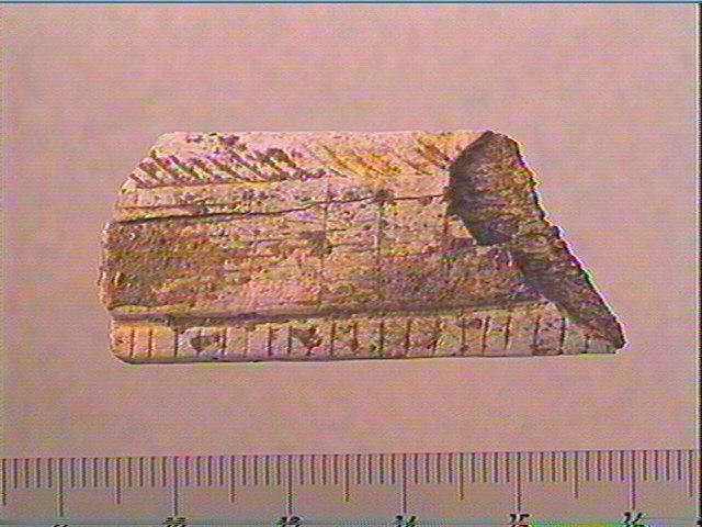 L'objet porte une large bande médiane, légèrement en relief, striée transversalement. Cette bande est bordée, d'un côté d'incisions obliques, et de l'autre d'incisions transversales.