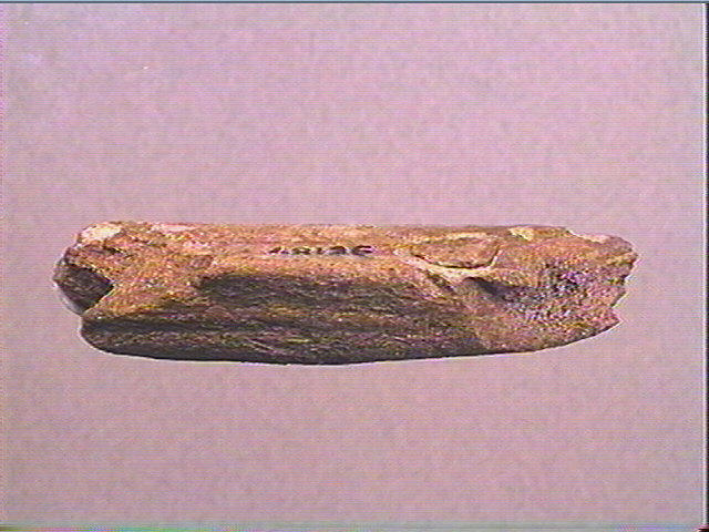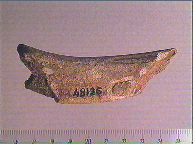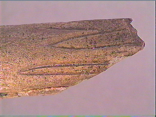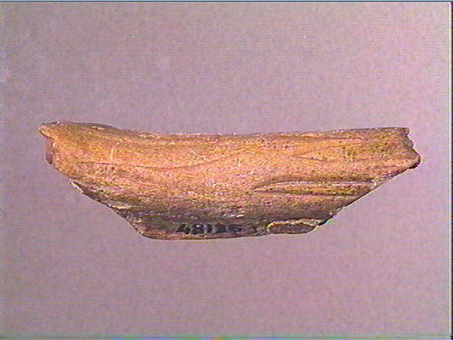 Incision profonde, coloration ocre, rainurage. Sur la partie concave du bois, trois longs motifs angulaires à l'une des extrémités et un autre, très long, à l'autre extrémité
