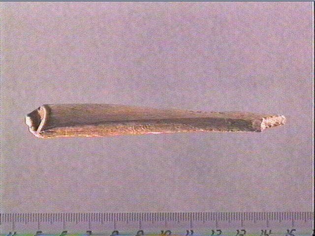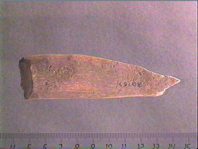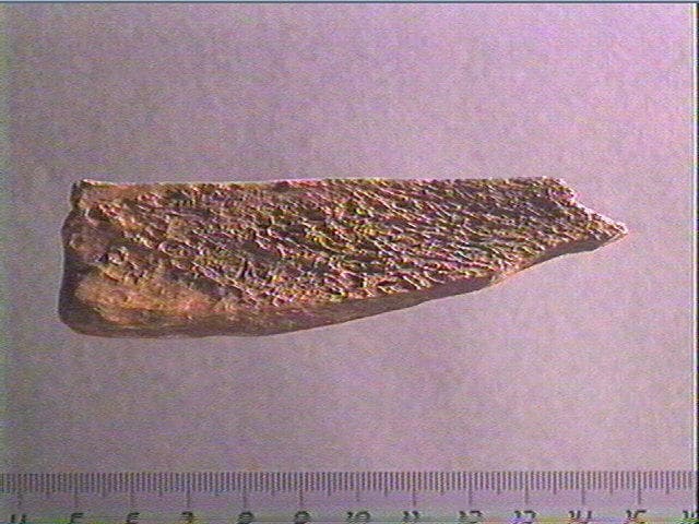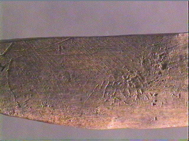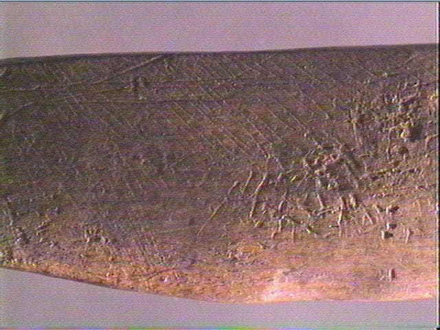 Sur une face, plusieurs rangées très serrées de fines stries obliques, alignées.