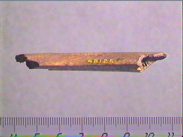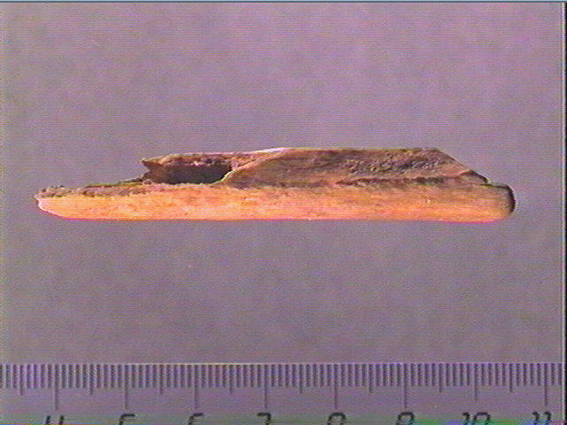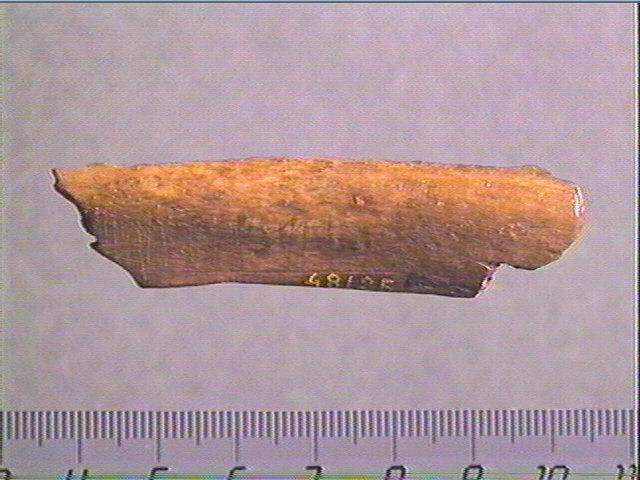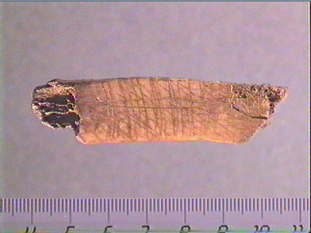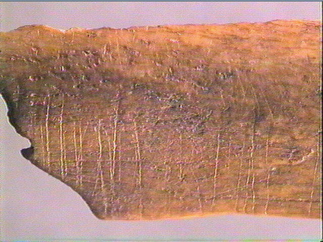 Sur une face, sur toute la largeur de l'os, lignes transversales et obliques, elles-mêmes recoupées par des lignes longitudinales médianes formant un quadrillage irrégulier. Sur l'autre face, d'un côté seulement, lignes transversales en gravure légère recoupées près du bord par une ligne longitudinale