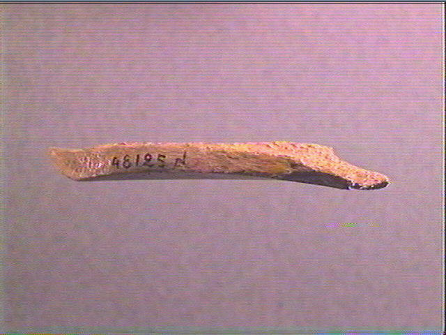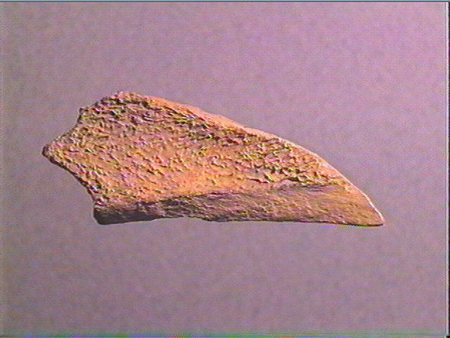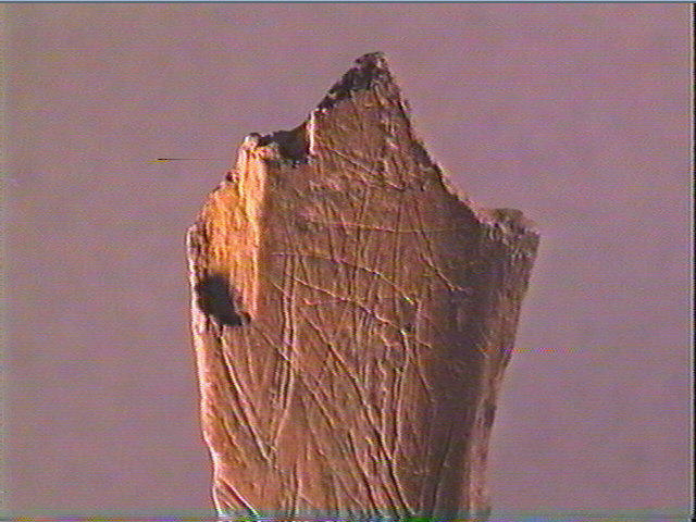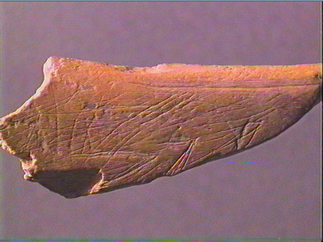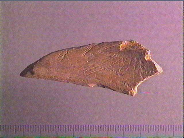 Gravures multiples sur une face : faisceaux de lignes obliques et longitudinales et trois chevrons emboîtés aux lignes reprises