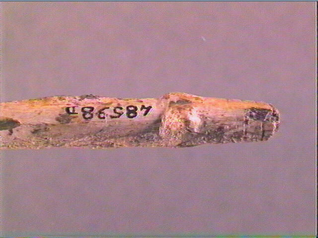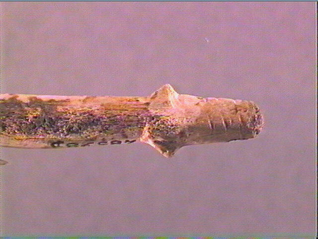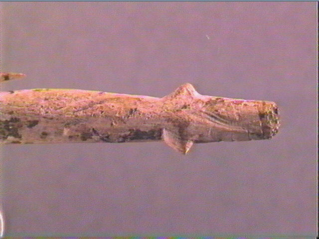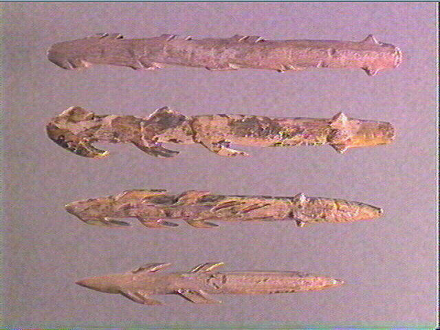 Les trois barbelures latérales droites sont entières, les deux barbelures latérales de gauche sont fracturées. Elles portent chacune des stries obliques exceptée celle de droite en partant de la tête. La base porte une figure géométrique en forme de croissant et quelques stries hémicylindriques