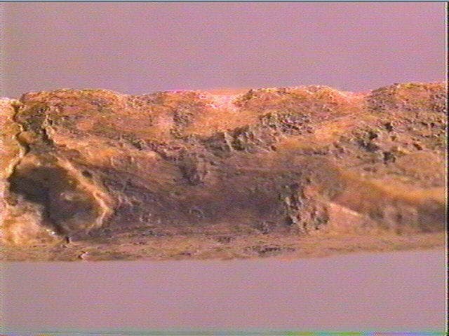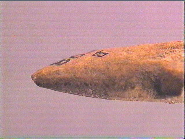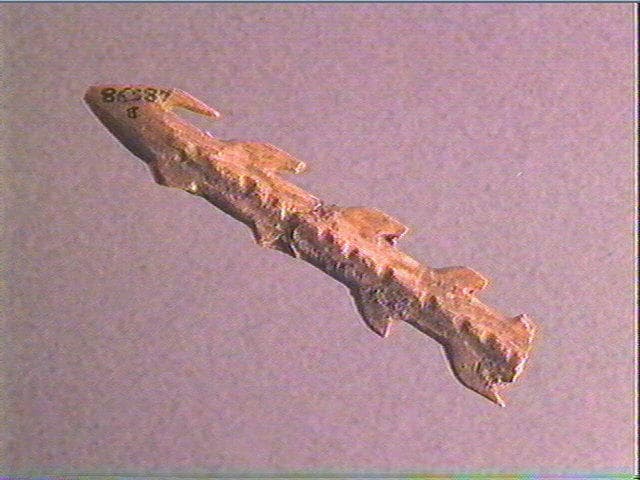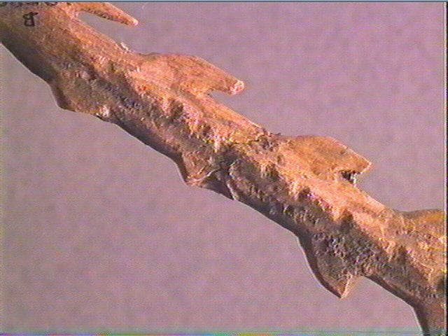 Sur une face, le fût porte une rangée médiane de crans alignés, encadrée de deux rangées d'entailles obliques