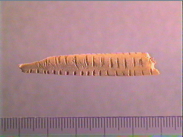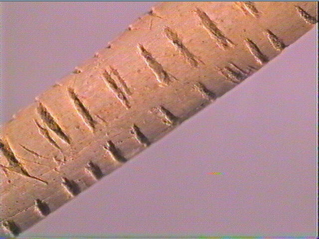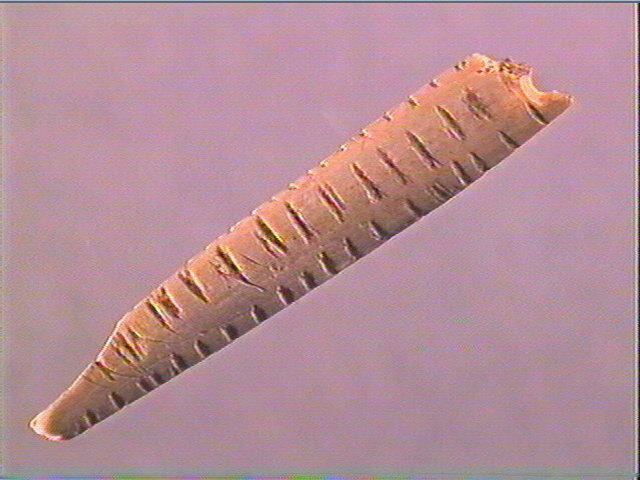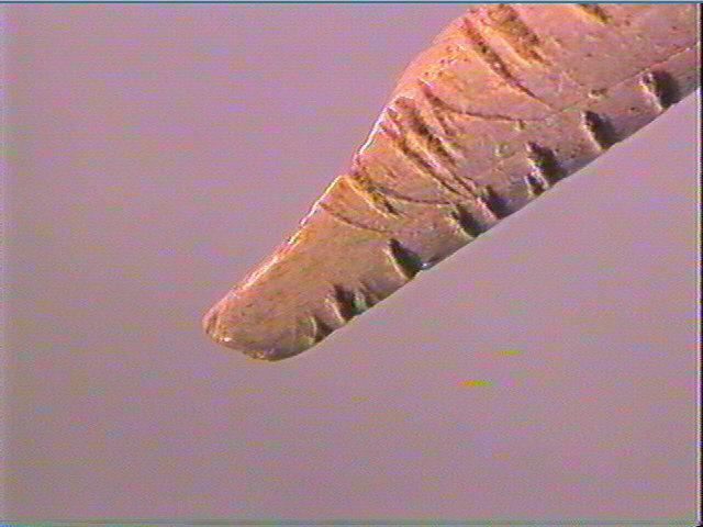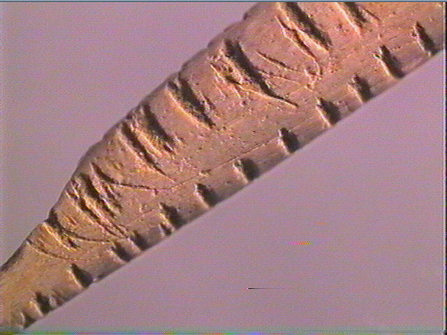 L'extrémité la plus large a été perforée puis fracturée. La pièce a été aussi biseautée. Plusieurs rangées de petites entailles transversales