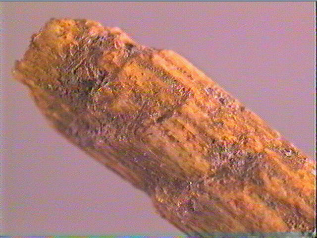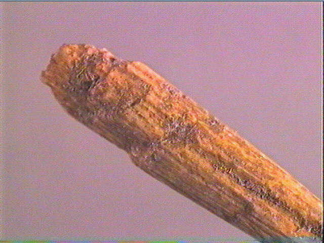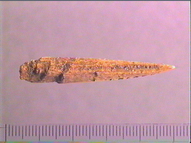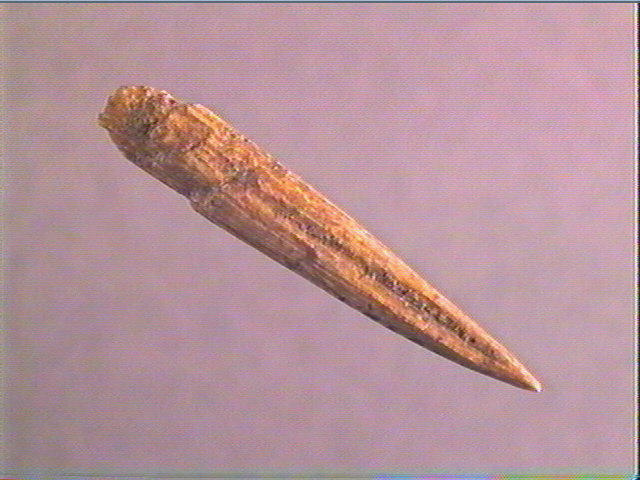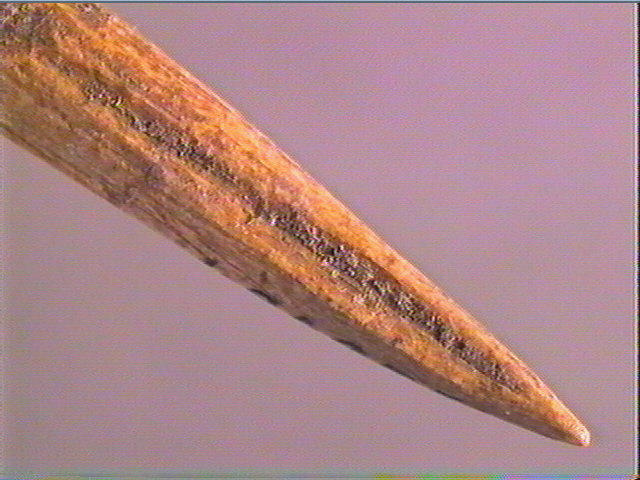 Courte sagaie avec une grande rainure longitudinale, médiane, et trois traits transversaux sur la face supérieure.. La face inférieure porte des stries obliques alignées