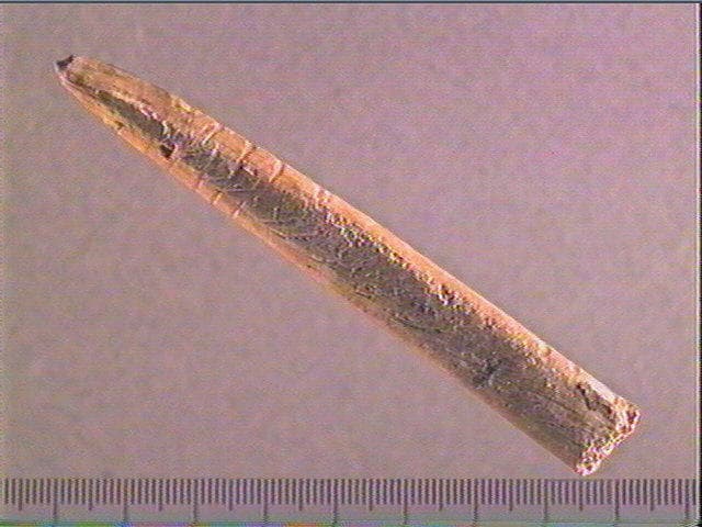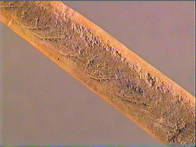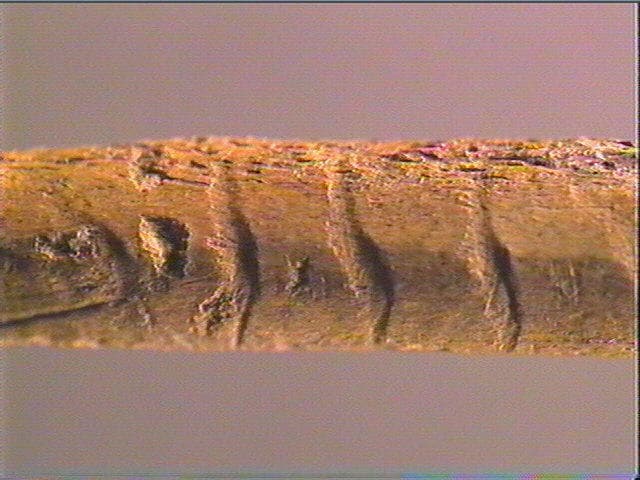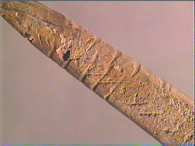 Vers l'extremité distale, incisions péricylindriques, profondes, recoupées par des stries obliques alignées, trés serrées et superficielles. Ces dernières occupent, elles, toute la surface. Sur un profil, arcs de cercle alignés longitudinalement.