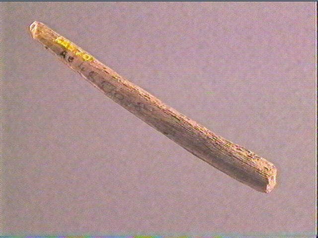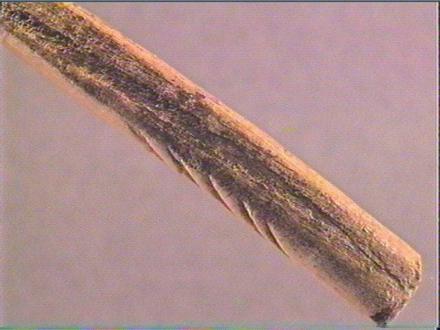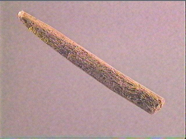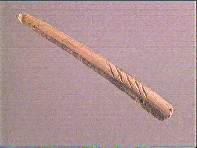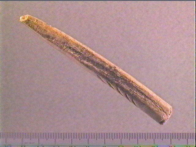 Incision en v dissymétrique profonde, rainurage longitudinal. Décor géométrique constitué de cinq traits obliques alignés sur le côté gauche. Les cinq incisions obliques sont bien marquées, s'apparentant plus à des entailles et créant, ainsi, un léger effet de champlevé. A signaler la rainure médiane, large et profonde qui traverse la face supérieure