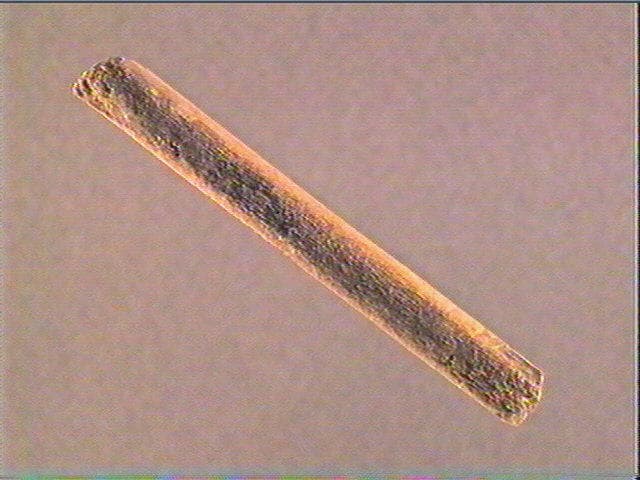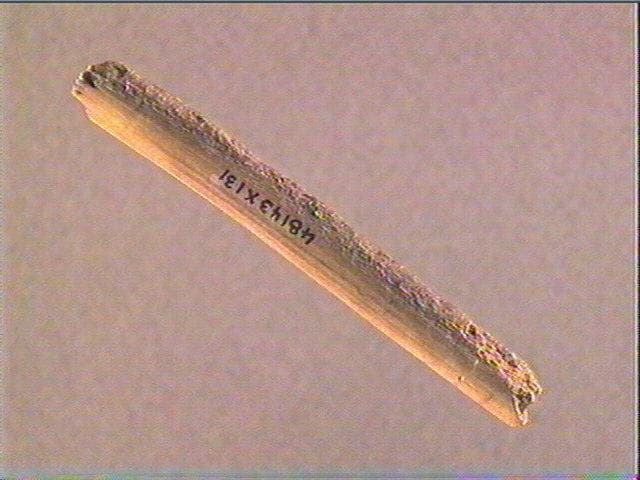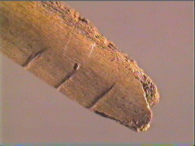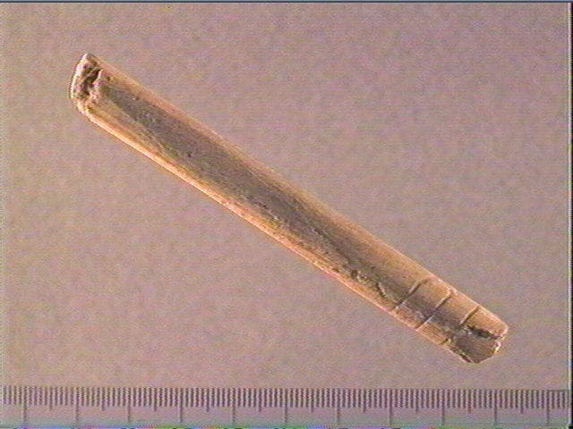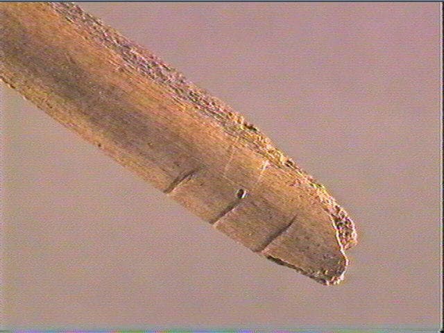 L'extrémité distale porte trois stries parallèles péricylindriques. Le biseau a été fracturé mais il semble qu'il portait deux rainures dont il reste l'extrémité proximale