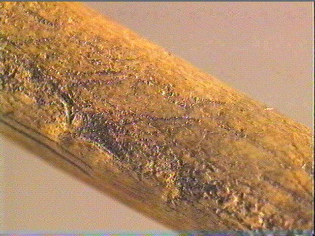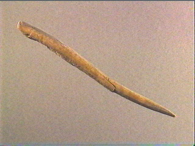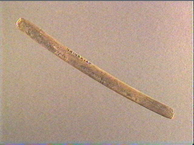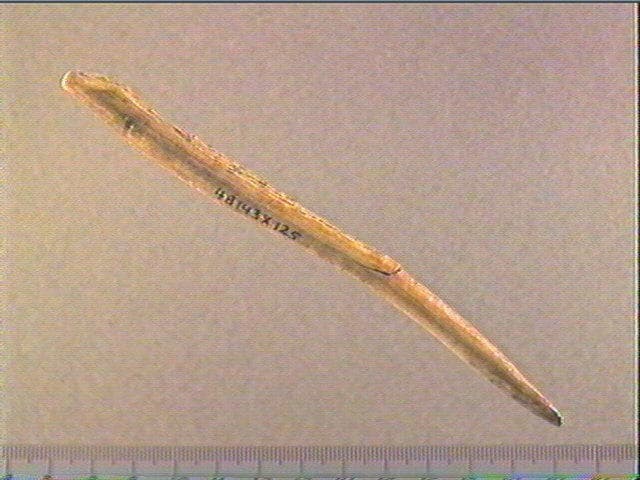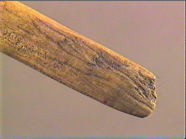 Rainurage longitudinal. La face supérieure porte une rainure sur laquelle se superposent de multiples stries serrées obliques et non organisées. Des stries longitudinales sensiblement sinueuses sont visibles sur le biseau. Le ciseau été fracturé dans sa partie médiane mais les fragments sont encore maintenus entre eux par une fine épaisseur de bois