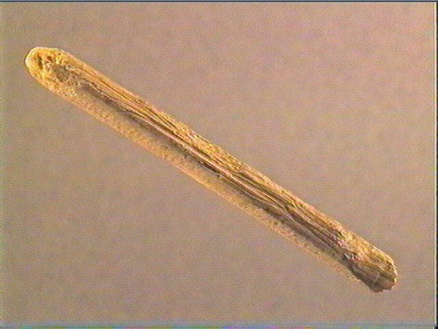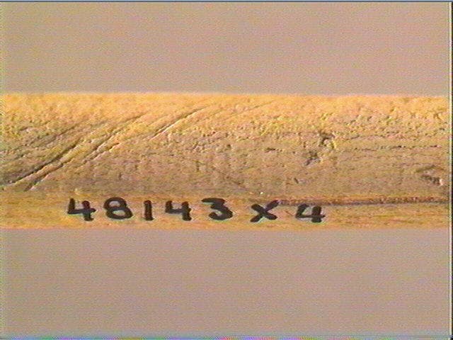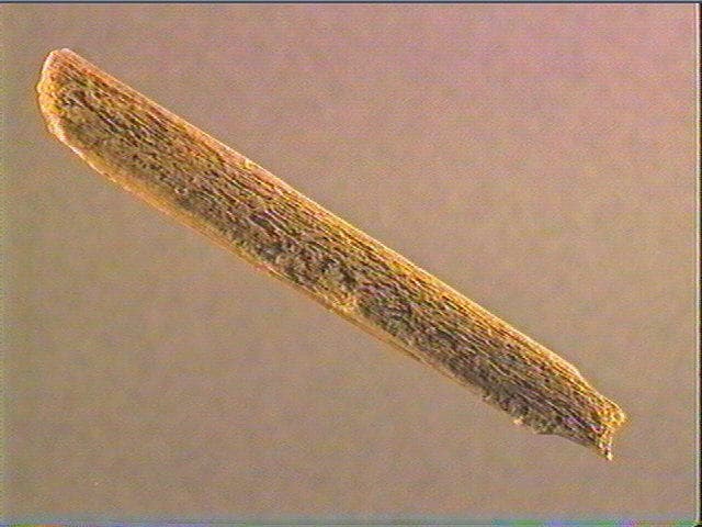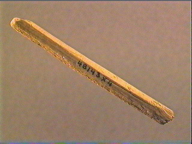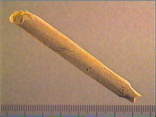 La face supérieure porte une série de stries non organisées et obliques. Au départ de l'étranglement figurant la pointe, quelques stries obliques sensiblement parallèles convergent. La pointe est fracturée et l'extrémité proximale est émoussée. Sur les deux côtés, stries longitudinales de fabrication de l'objet