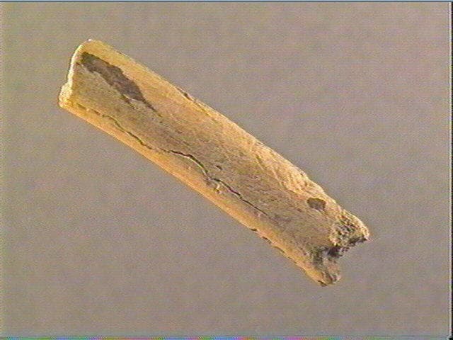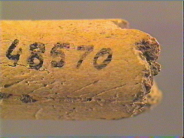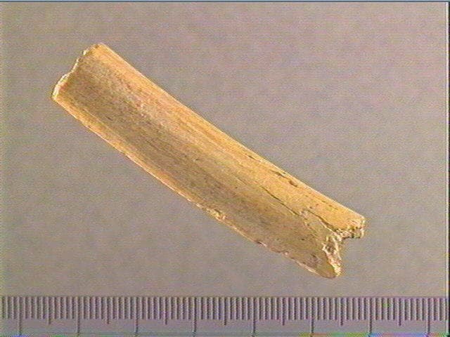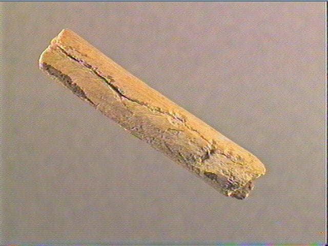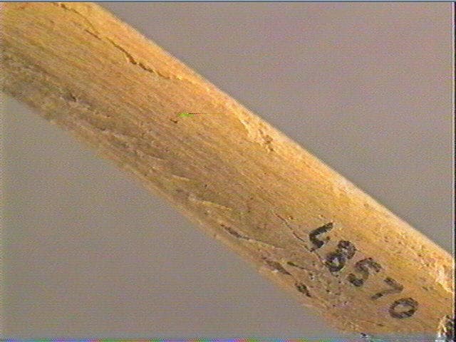 La face supérieure et la face inférieure portent une rangée de stries obliques parallèles. Sur la face inférieure, elles ont été amputées par la fente du bois