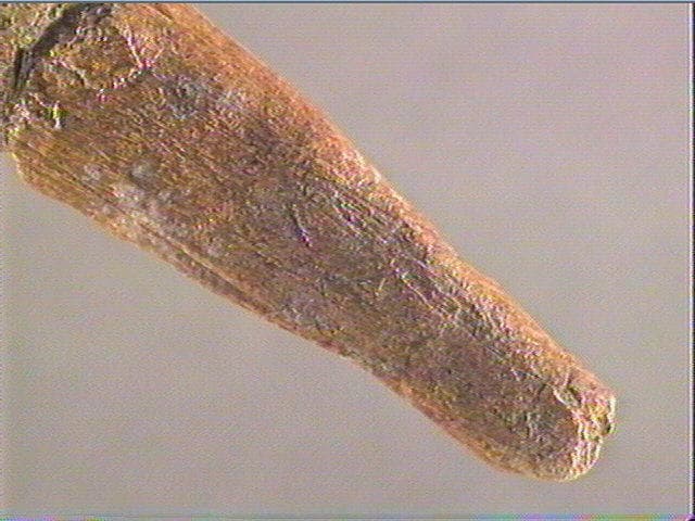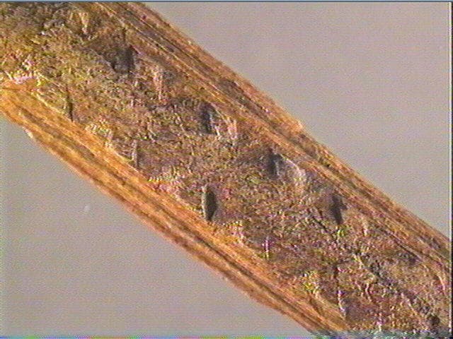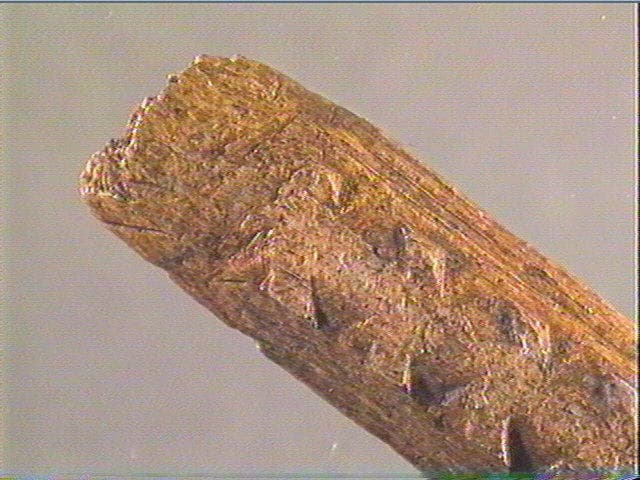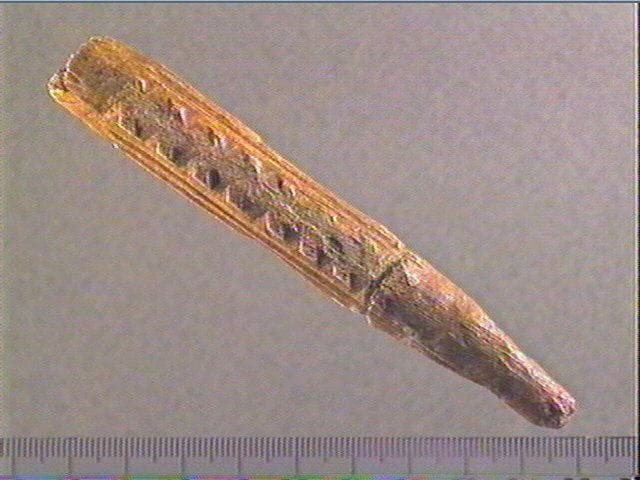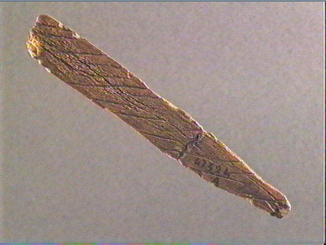 La face supérieure porte deux rangées de tubercules rectangulaires, bordés de part et d'autre par une ou 2 rainures longitudinales. Sur la face plane, se trouve une série de longues stries obliques qui s'étendent sur la totalité de la surface.