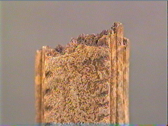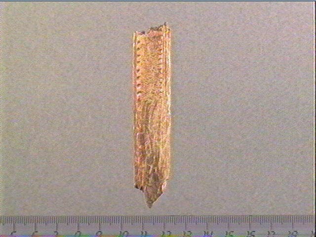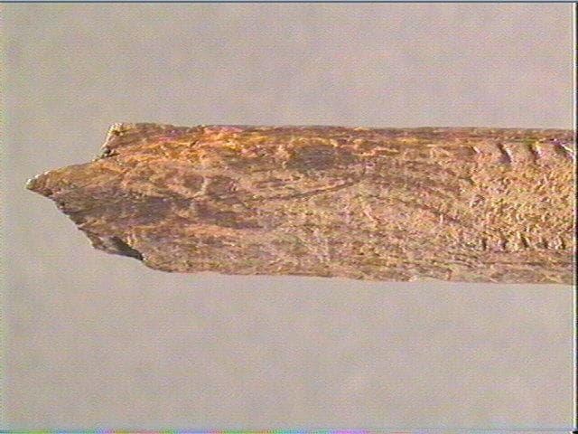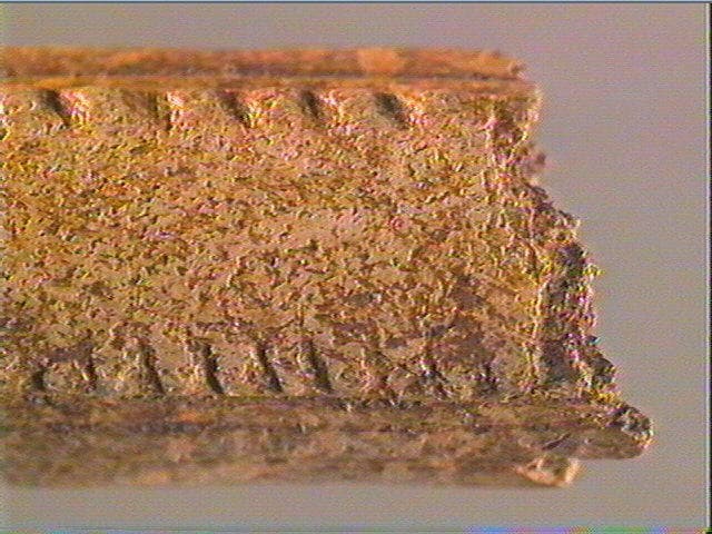 Enlèvement en dents de scie. Sur la face supérieure, la moitié du décor consiste en deux rangées de tubercules dont l'une est plus saillante que l'autre. Latéralement, ces tubercules sont encadrés de rainures longitudinales. L'autre moitié du décor est gravée d'une série de longues lignes sinueuses. La face inférieure porte de longues stries obliques recoupées par de longues lignes disposées en sens inverse.