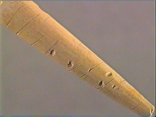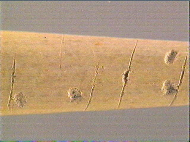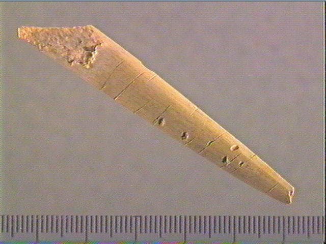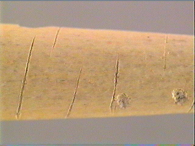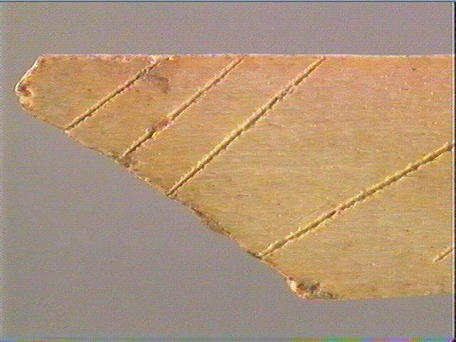 La face supérieure porte de fines stries transversales dont l'emplacement est irrégulier. La face inférieure porte des stries obliques alignées, espacées irrégulièrement