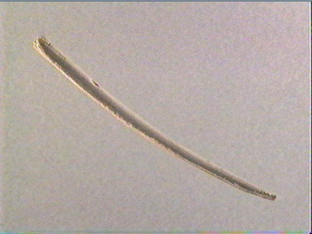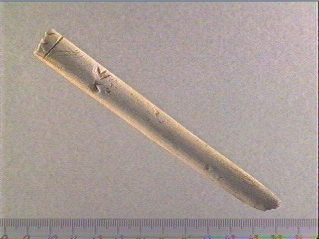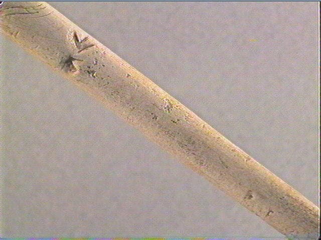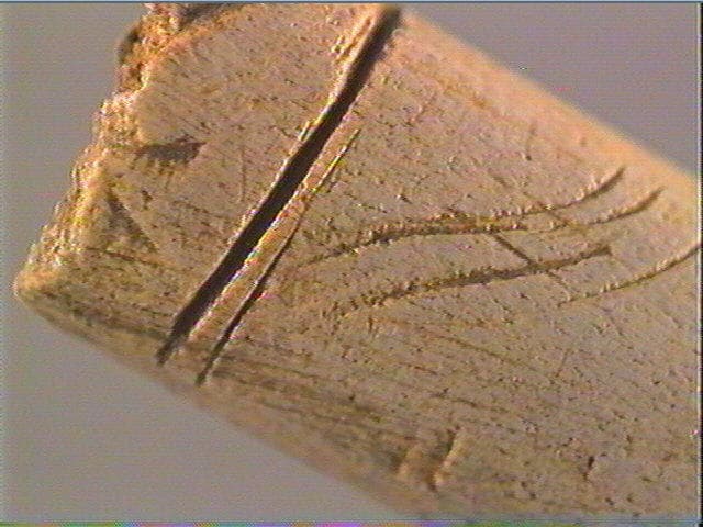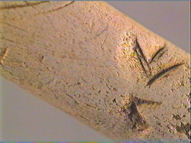 Incision fine, incision en v dissymétrique, incision large. A une extrémité, une entaille transversale. Au-dessous, quelques incisions courbes et obliques. PLus bas, un chevron avec une entaile centrale en 'flèche' et à côté, un chevron simple.
