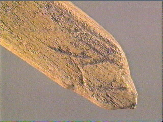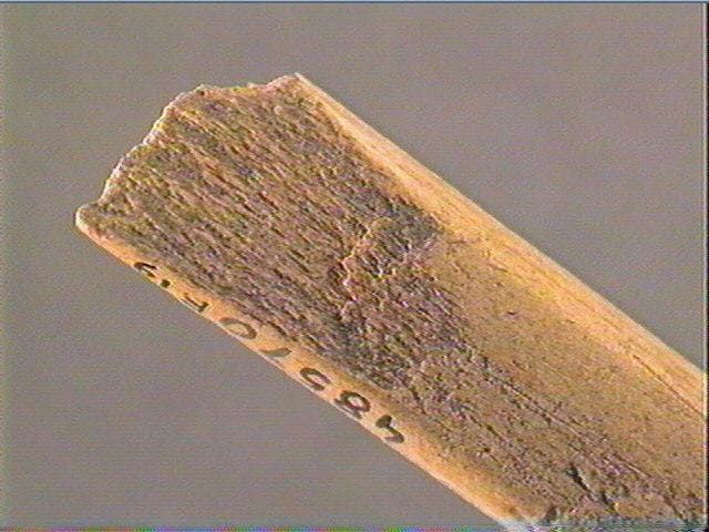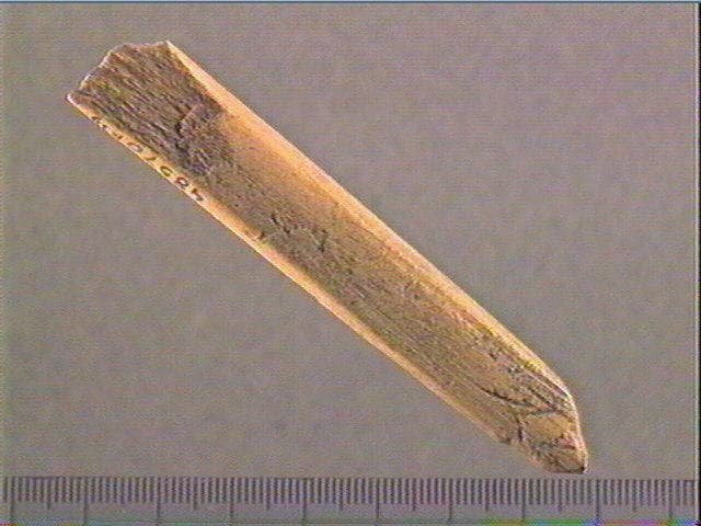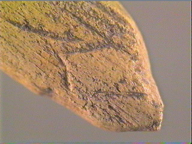 La section est plate. La face supérieure est ornée d'un motif losangique accompagné de deux traits, à son extrémité distale et pointue; sur la surface, des stries de fabrication. La face inférieure porte quatre traits courbes, obliques et parallèles.