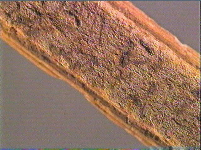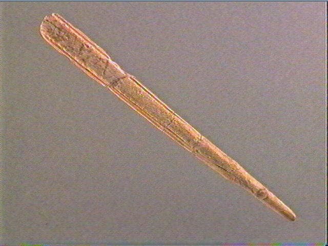 La face supérieure forme une surface plano-convexe encadrée par de longues rainures. La surface est ornée de petites stries transversales. La face inférieure porte une multitude de stries obliques entaillées par une longue rainure longitudinale profonde