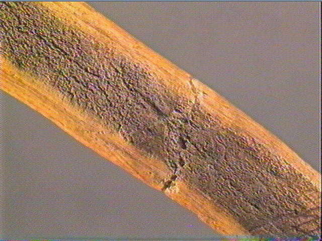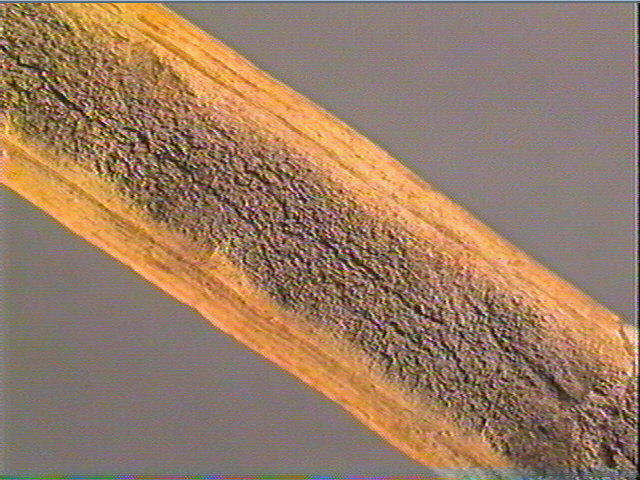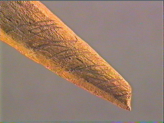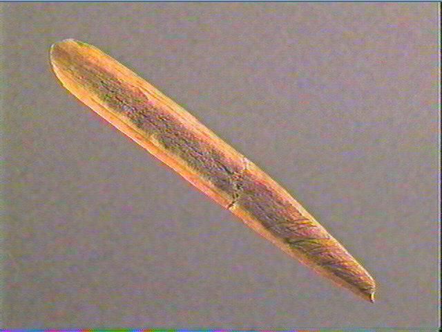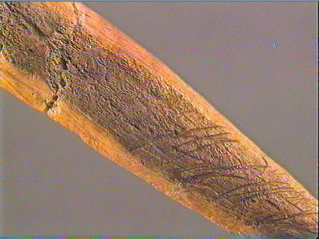 La face supérieure est ornée de stries obliques et irrégulières au niveau de la partie distale. La face supérieure est plano-convexe. Sur la face inférieure, quelques stries inorganisées sont visibles