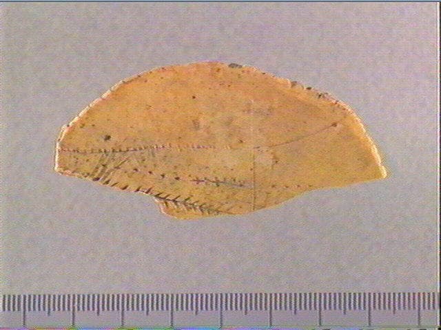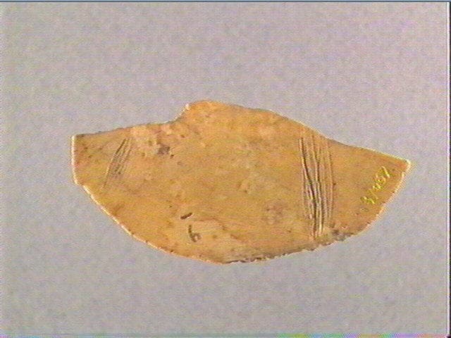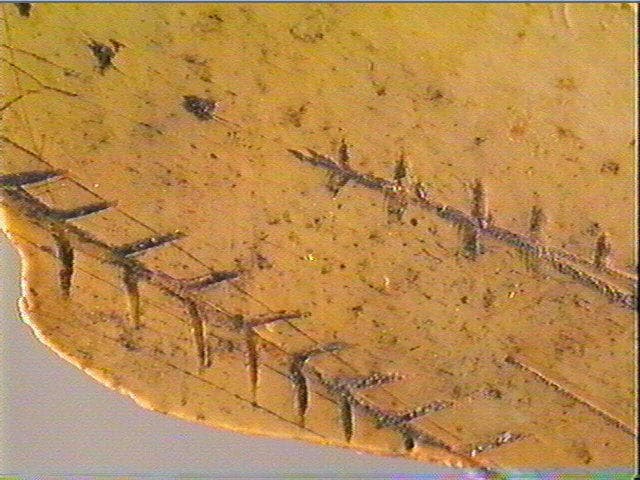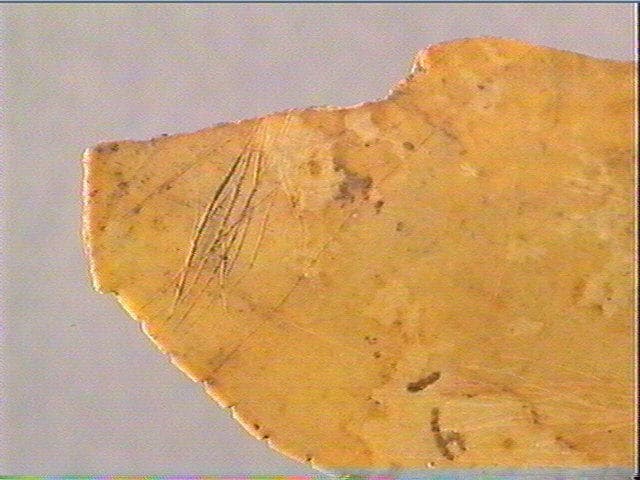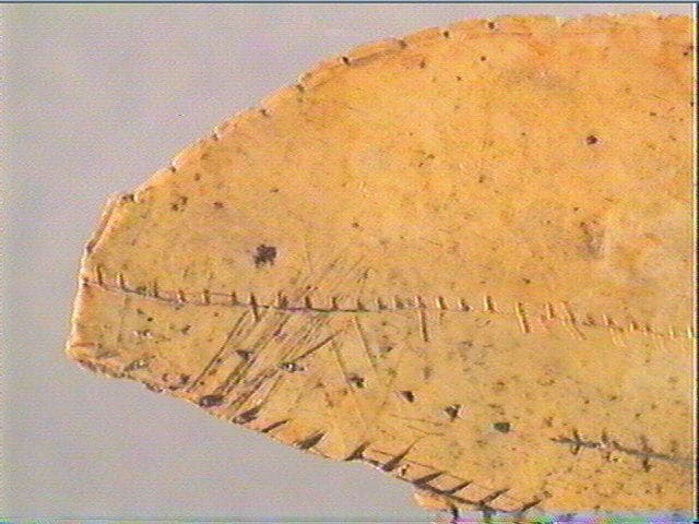 Sur une face : encoches sur le pourtour, motif barbelé, lignes striées. Sur l'autre face : stries transversales alignées.