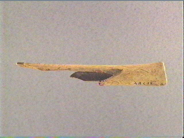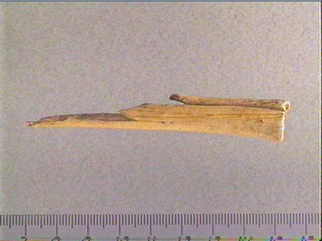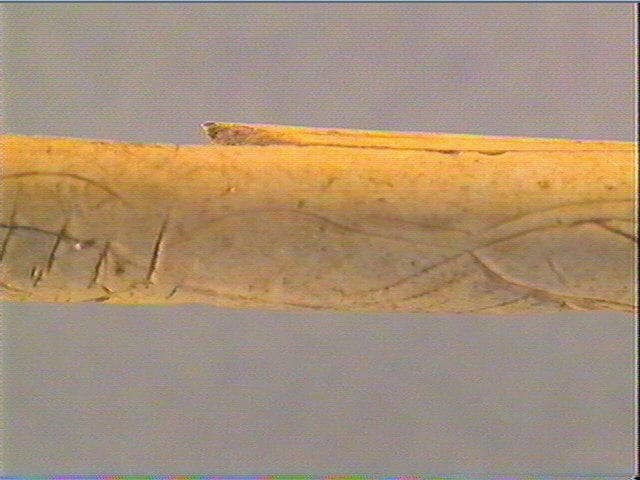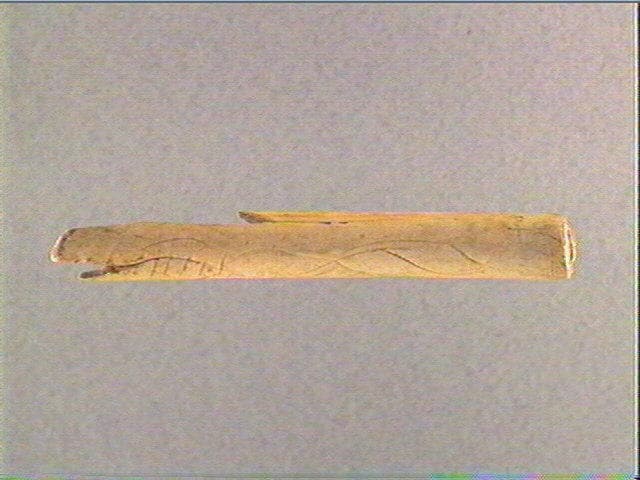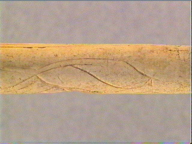 Plusieurs motifs pisciformes dont trois alignés et un strié transversalement. L'extrémité distale est ornée d'une série de rainures longitudinales
