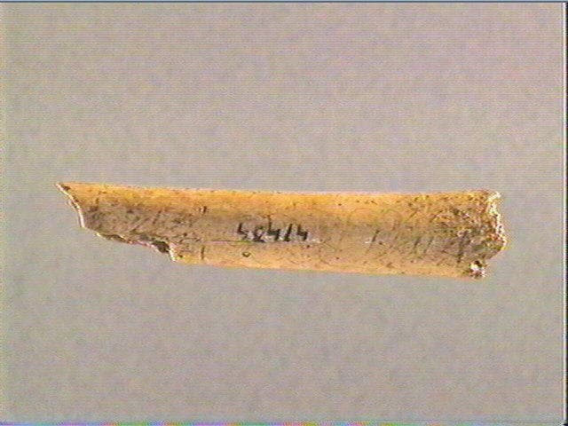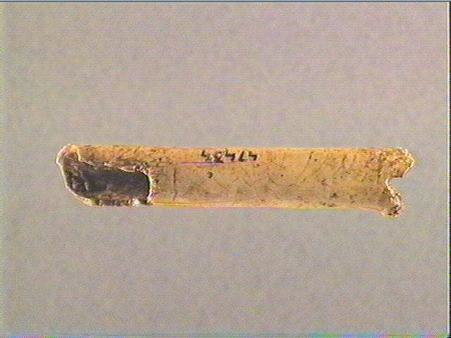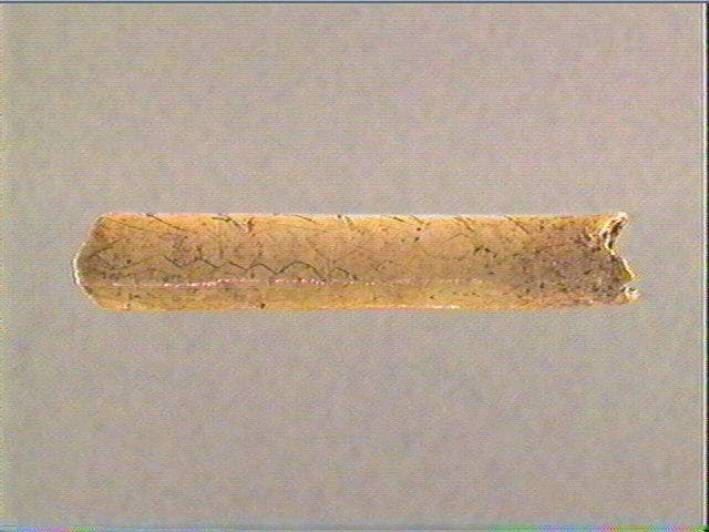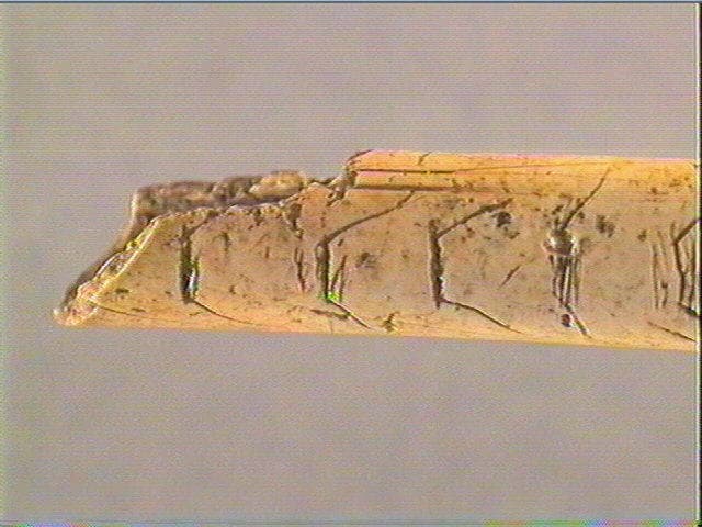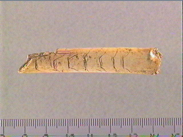 Incision fine, incision en v. Sur une face : décor singulier composé de sept traits transversaux et alignés dont chaque extrémité porte des lignes obliques divergentes. Sur les deux côtés : lignes brisées et sinueuses.