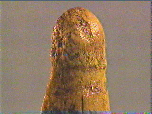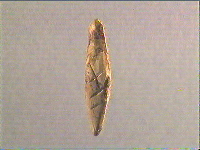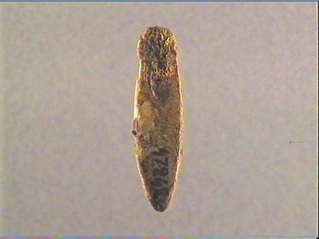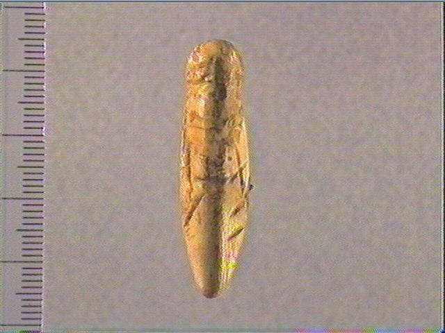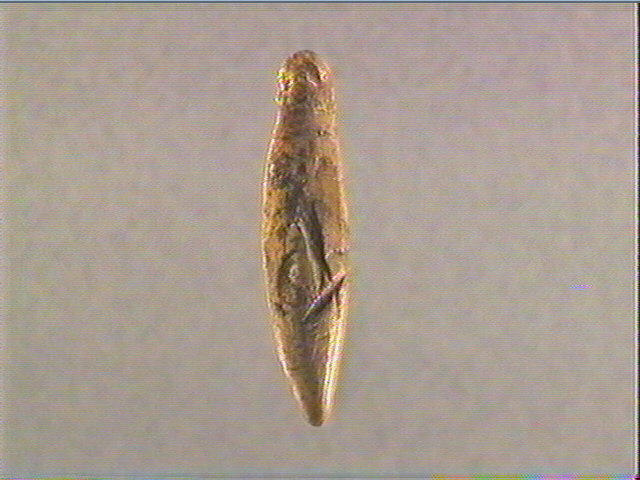 Cet objet fusiforme montre une rainure de suspension, quelques traits obliques et deux croisillons.