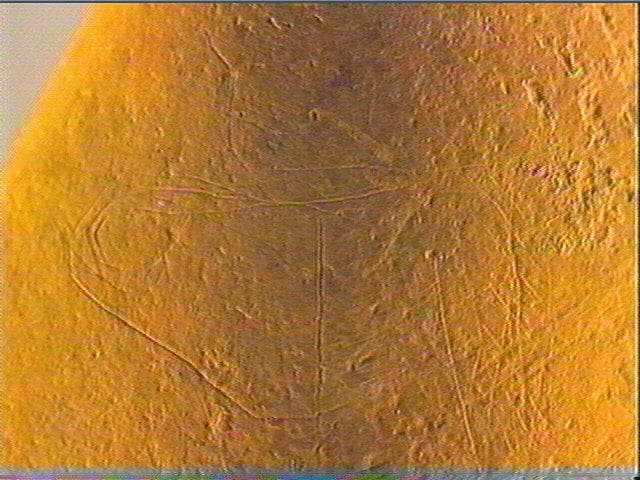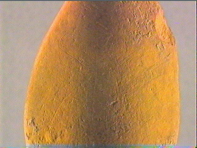 Peut-être une tête de cheval de profil gauche avec le chanfrein, le museau et le naseau, l'encolure et la crinière marquée par une série de stries courtes obliques