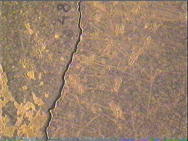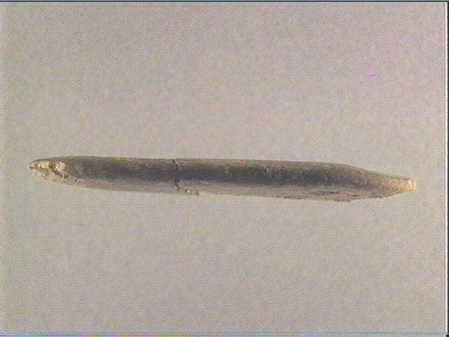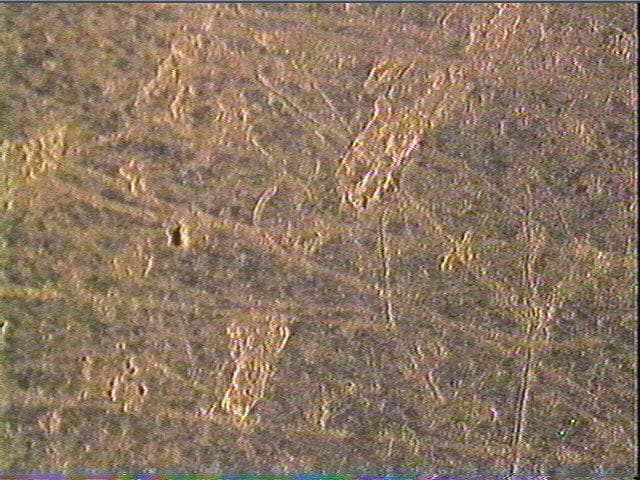 Traces de percussion aux extrémités. Sur les deux faces, stries sans organisation apparente, exceptée une ébauche de tête animale de profil droit avec le front, le chanfrein, le museau, le naseau, le menton